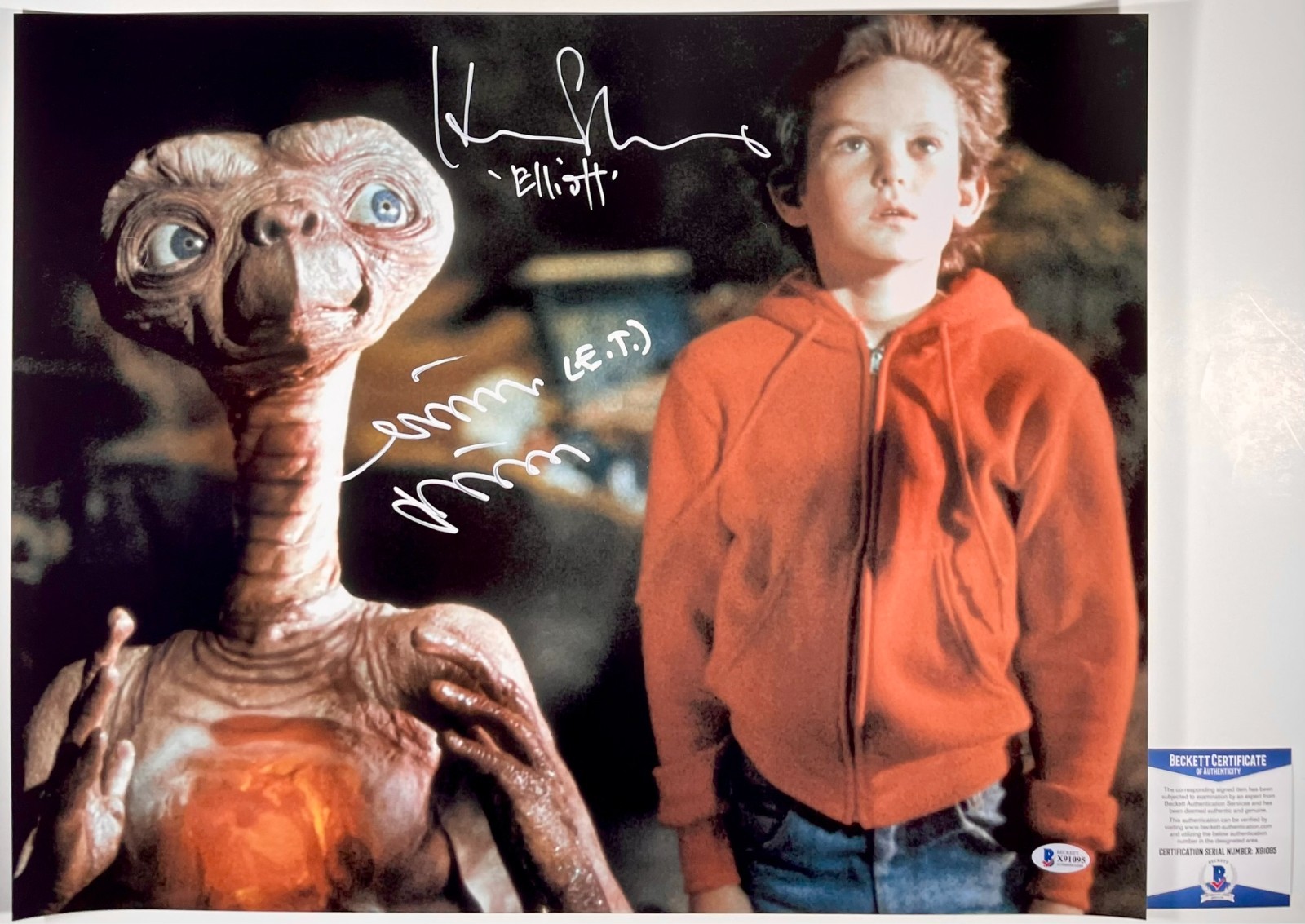Professionally printed E.T. the Extra-Terrestrial 16×20 Photo, hand signed in person by actors Henry Thomas who played Elliott, and Matthew DeMeritt who played E.T in the 1982 Steven Spielberg classic, E.T. the Extra-Terrestrial. This is two clean, well placed signatures, with character names “Elliott” and “E.T.” inscriptions, signed in a matching, flowing White 2MM Molotow Paint Pen that really pops off of this crisp, professionally printed 16×20 Photo. A clear plastic 16×20 toploader is included with purchase to safely ship the photo inside of unless the buyer specifies at checkout that they prefer the photo rolled in a tube. Item has been authenticated by Beckett Authentication Services, one of the most reputable third-party authentication companies in the world, and includes the Beckett Certificate Of Authenticity card.