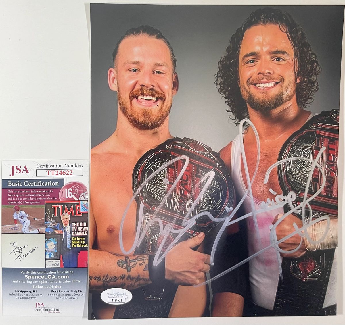 Professionally printed 8×10 photo, dual signed by former IWGP and IMPACT Wrestling Tag Team Champions Juice Robinson and David Finlay the team of FinJuice. This is two clean, well placed signatures that really pop off of this crisp, professionally printed 8×10 photo. Item has been authenticated by James Spence Authentications and includes the JSA Certificate Of Authenticity card.