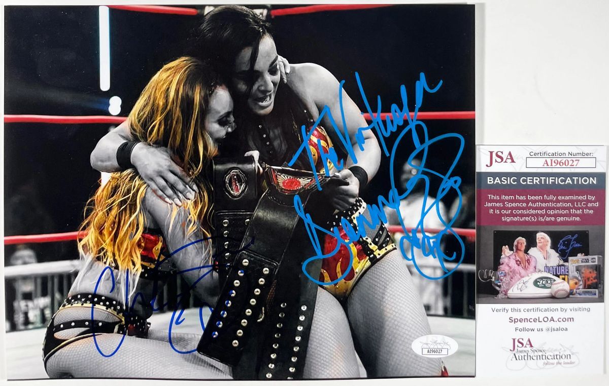 Professionally printed spotlight 8×10 photo, hand signed by WWE NXT Superstar Chelsea Green and current IMPACT Wrestling Knockout, “The Virtuosa” Deonna Purrazzo. This is two clean, well placed signatures that really pop off of this crisp, professionally printed spotlight 8×10 photo. Item has been authenticated by James Spence Authentications, and includes the JSA Certificate Of Authenticity card.