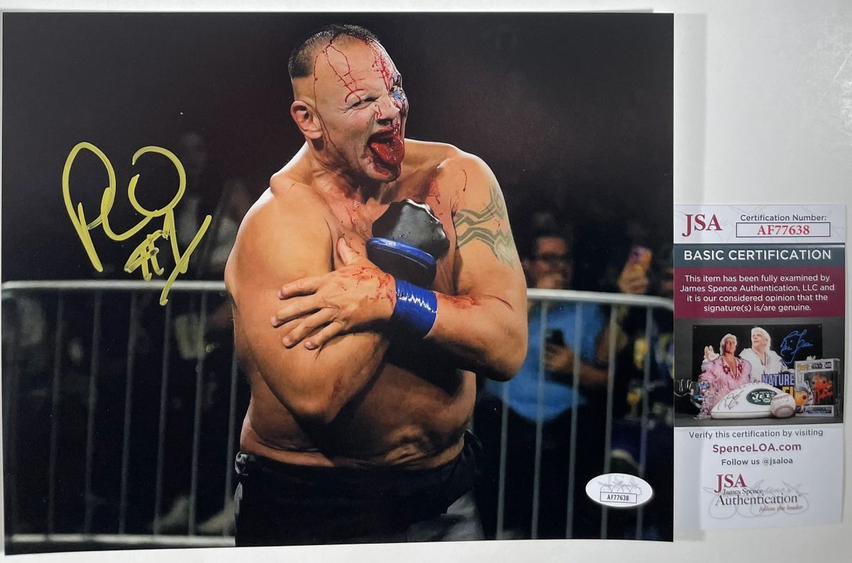 Professionally printed 8×10 photo, hand signed by IMPACT Wrestling competitor and a member of the faction Honor No More, “The French Canadian Frankenstein” PCO. Before his resurgence in Ring of Honor Wrestling (ROH) and IMPACT Wrestling, PCO competed in the WWF in the early nineties as one half of the World Tag Team Champion Quebecers, Quebecer Pierre, and later as Jean-Pierre LaFitte. This is a clean, well placed signature that really pops off of this crisp, professionally printed 8×10 photo. Item has been authenticated by James Spence Authentications and includes the JSA Certificate Of Authenticity card.