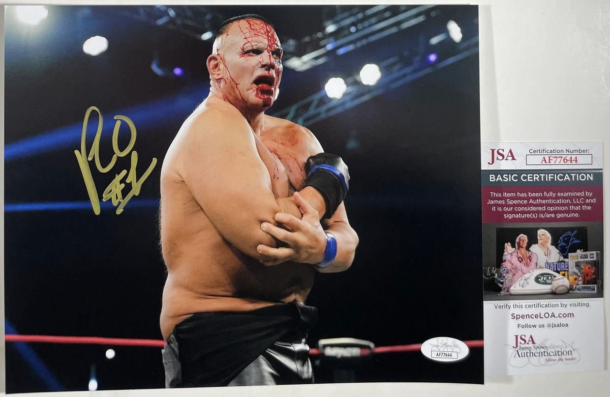 Professionally printed 8×10 photo, hand signed by IMPACT Wrestling competitor and a member of the faction Honor No More, “The French Canadian Frankenstein” PCO. Before his resurgence in Ring of Honor Wrestling (ROH) and IMPACT Wrestling, PCO competed in the WWF in the early nineties as one half of the World Tag Team Champion Quebecers, Quebecer Pierre, and later as Jean-Pierre LaFitte. This is a clean, well placed signature that really pops off of this crisp, professionally printed 8×10 photo. Item has been authenticated by James Spence Authentications and includes the JSA Certificate Of Authenticity card.