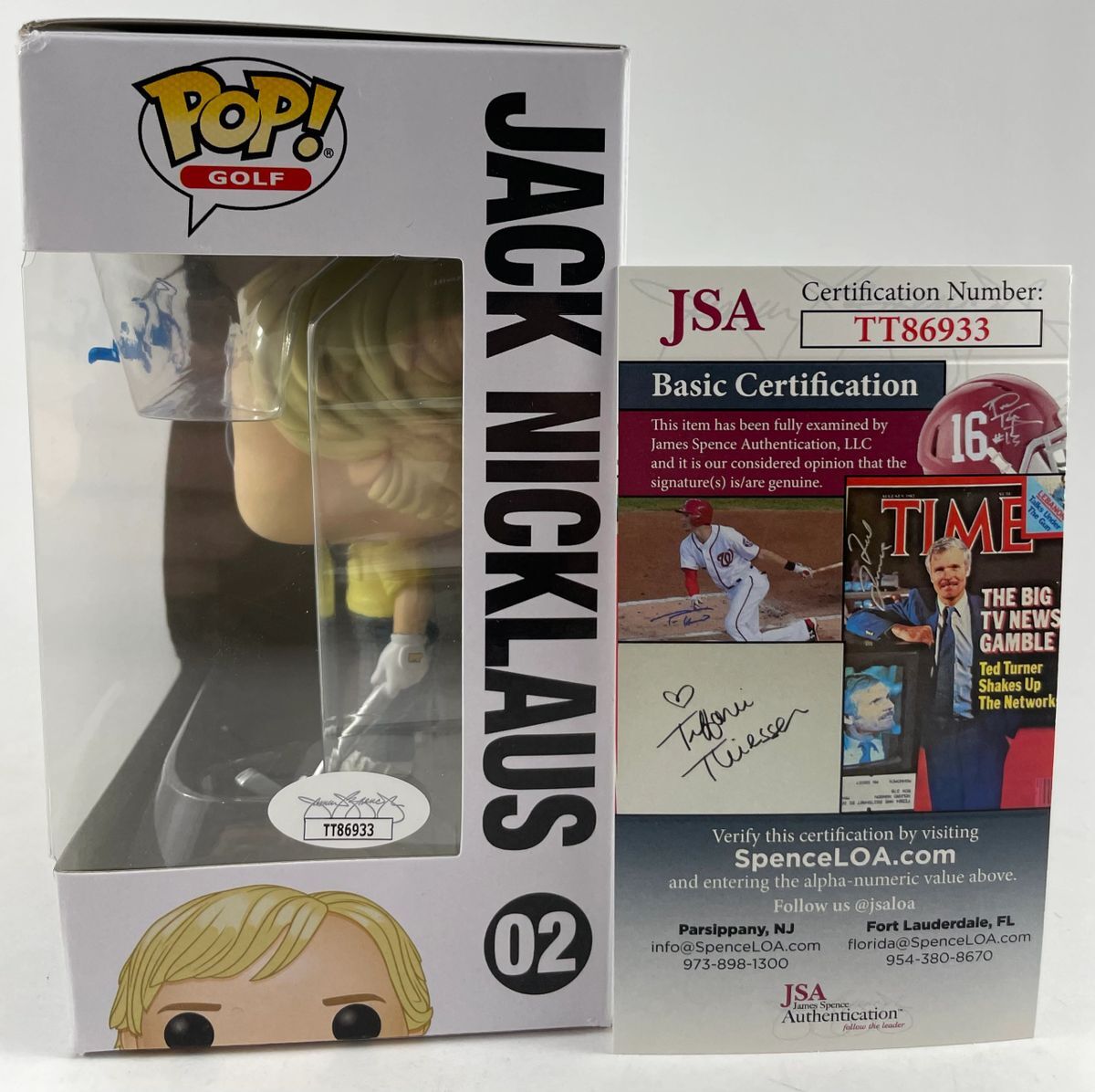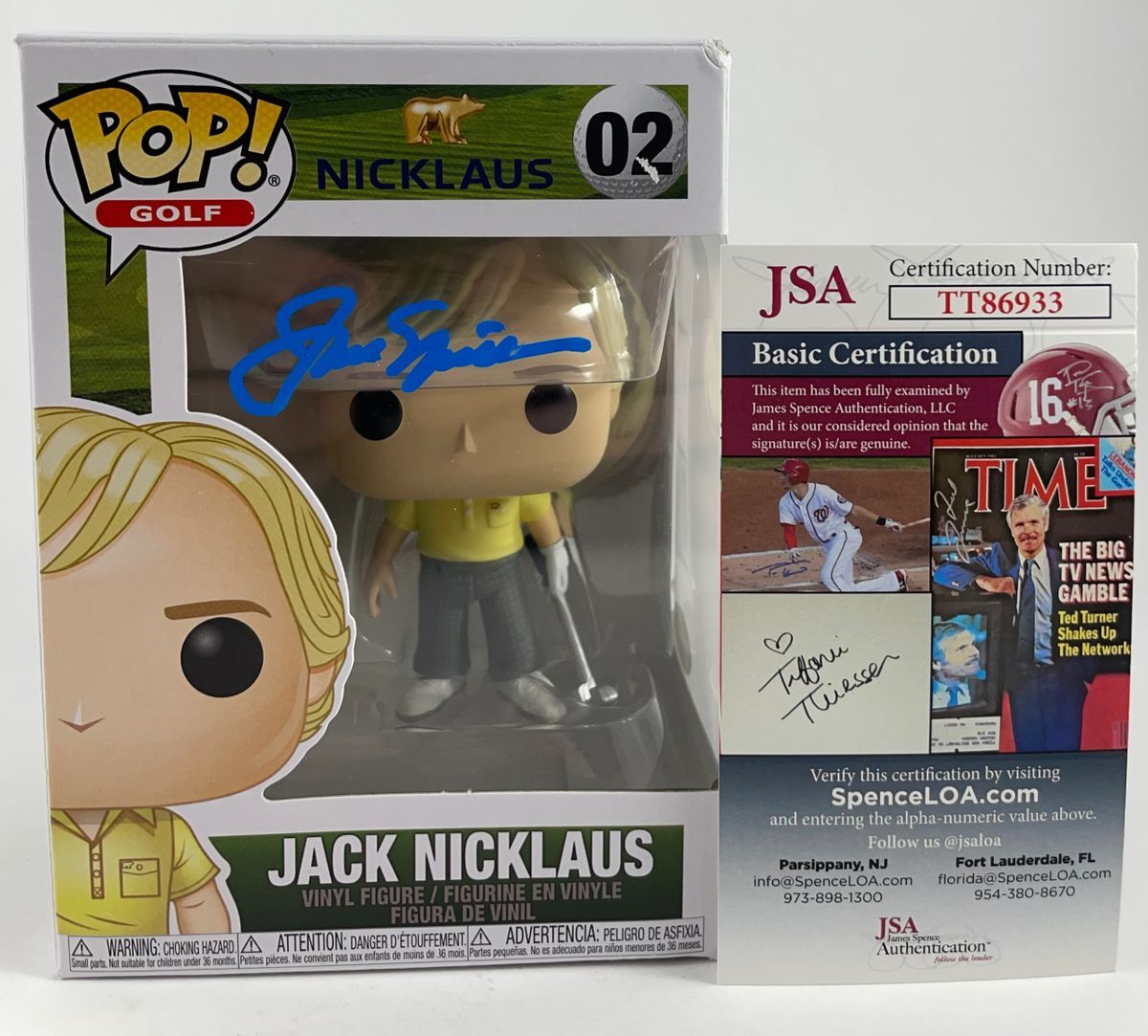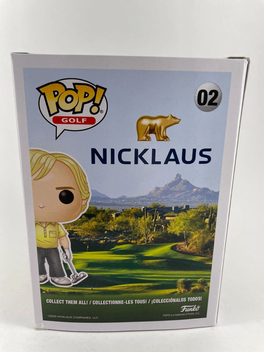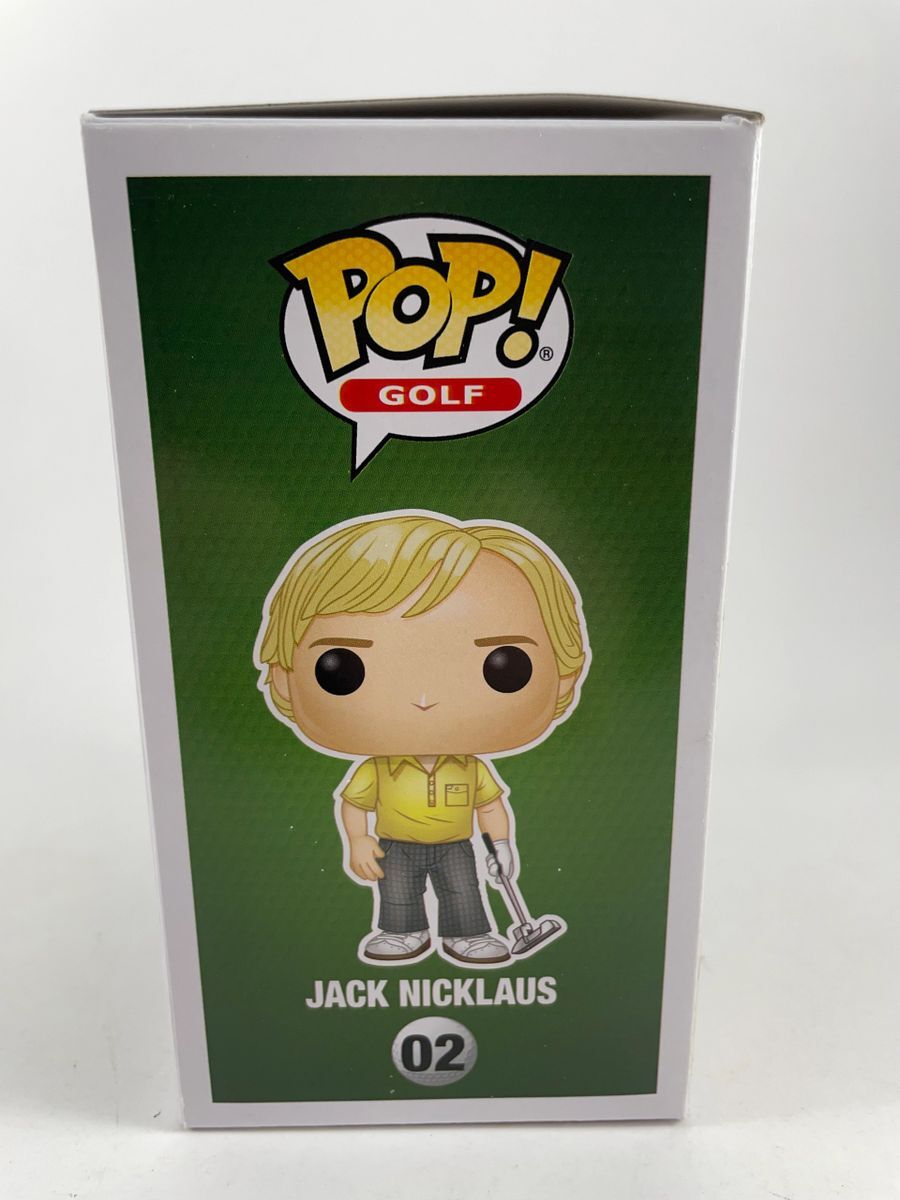 Jack Nicklaus Golf’s Greatest Funko POP #02, hand signed by the “Golden Bear” himself PGA legend Jack Nicklaus. This is a clean, well placed signature, signed in a flowing blue paint pen that really pops off of the plastic. Please see photos before purchasing as this is the exact item you will receive. There is a minor ding to the top right corner, however POP still displays great. Item has been authenticated by James Spence Authentications, and includes the JSA Certificate of Authenticity card. JSA COA# TT86933