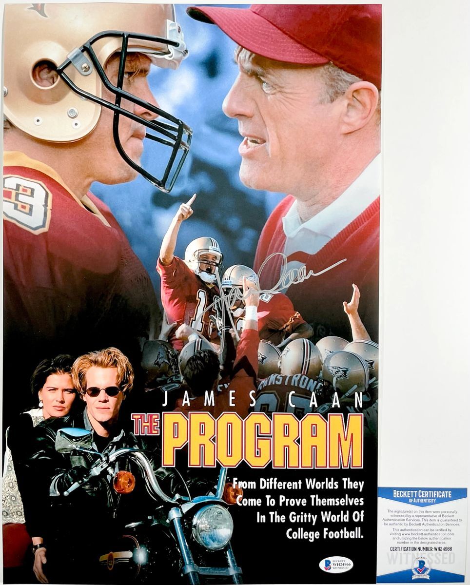 Professionally printed The Program 11×17 movie poster, hand signed in person by late great actor James Caan who starred as Coach Sam Winters in the 1993 film, The Program. This is a clean, well placed signature, signed in a flowing Silver that really pops off of this crisp, professionally printed The Program 11×17 movie poster. Item was witnessed being signed by Beckett Authentication Services, one of the most reputable third party authentication companies in the world, and includes the Beckett Witness Certificate of Authenticity card.