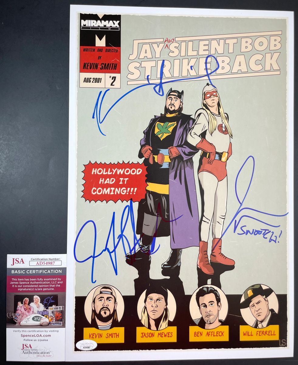 Professionally printed Jay & Silent Bob Strike Back 11×17 movie poster, hand signed by three members of the cast. This is three clean, well placed signatures, that really pop off of this crisp, professionally printed Jay & Silent Bob Strike Back 11×17 movie poster. Collectible was signed by the following three cast members. 1. Kevin Smith – Silent Bob, Writer, Director 2. Jason Mewes – Jay 3. Jeff Anderson – Randal Graves Kevin Smith has written and directed a number of iconic films over the last three decades including, Clerks, Chasing Amy, Dogma, and Mallrats just to name a few. Item has been authenticated by James Spence Authentications, and includes the JSA Certificate of Authenticity Card. JSA COA# AD54987