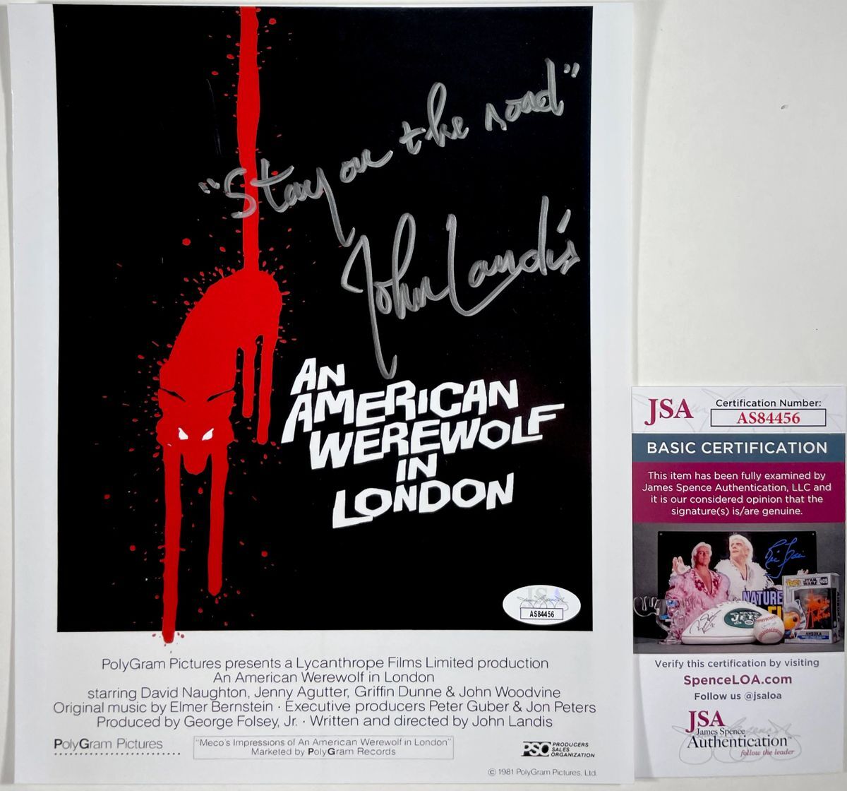 Professionally printed An American Werewolf In London 8×10 Mini Movie Poster Photo, hand signed in person by Director John Landis who directed the film An American Werewolf In London as well as many other classic films. This is a clean, well placed signature, with a “Stay on the road” inscription, signed in a flowing Silver that really pops off of this crisp, professionally printed An American Werewolf In London 8×10 Mini Movie Poster Photo. Item has been authenticated by James Spence Authentications, one of the most reputable third party authentication companies in the world, and includes the JSA Certificate of Authenticity card.