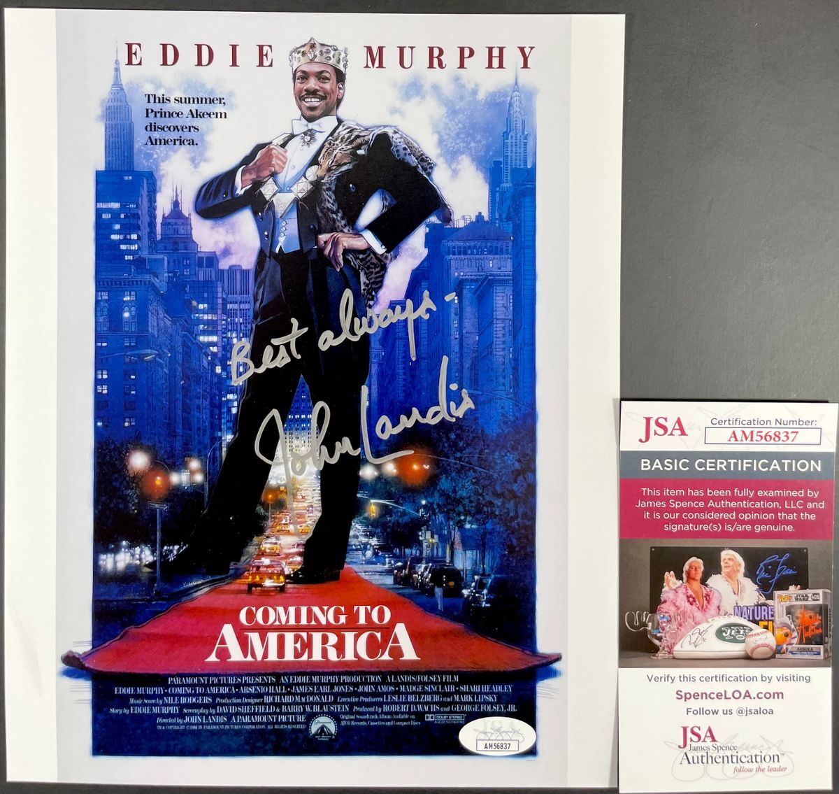 Professionally printed Coming To America 8×10 Mini Movie Poster Photo, hand signed by Director John Landis who directed the film Animal House among many other classic films. This is a clean, well placed signature, with “Best Always” inscription that really pops off of this crisp, professionally printed Coming To America 8×10 Mini Movie Poster Photo. Item has been authenticated by James Spence Authentications , and includes the JSA Certificate of Authenticity card. JSA COA# AM56837