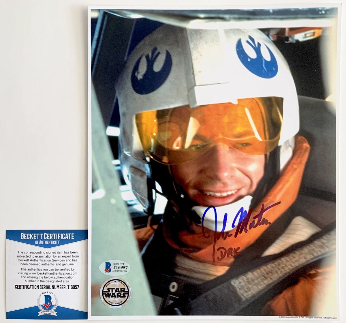 Star Wars Dak Official Pix 8×10 photo hand signed in person by actor John Morton who played the role of Dax in Star Wars: Episode V – The Empire Strikes Back. This is a clean, well placed signature with character name “Dak” inscription, signed in a flowing Blue Sharpie that really pops off of this crisp, Official Pix 8×10 photo. A clear plastic 8×10 toploader is included with purchase to safely ship the photo inside of. The photo has the Star Wars Officially Licensed Photograph Hologram and the item has also been authenticated by Beckett Authentication Services, one of the most reputable third-party authentication companies in the world and includes the Beckett Certificate Of Authenticity card.