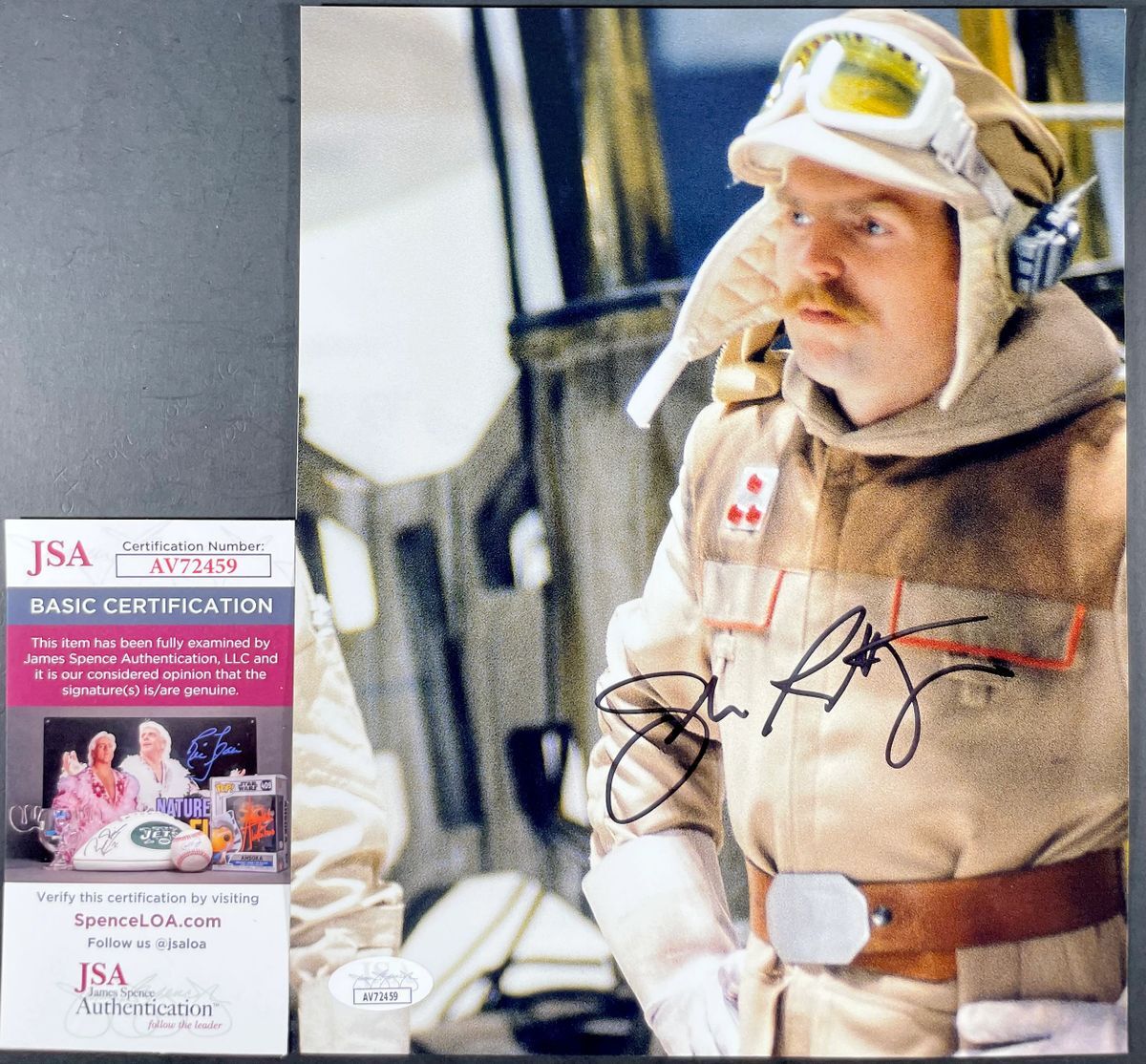 Professionally printed 8×10 photo, hand signed in person by actor John Ratzenberger who played the roll of Rebel Force Major Derlin in the 1980 classic, Star Wars: Episode V – The Empire Strikes Back. This is a clean, well placed signature, signed in a flowing Black Sharpie that really pops off of this crisp, professionally printed 8×10 photo. Item has been authenticated by James Spence Authentications, one of the most reputable third party authentication companies in the world, and includes the JSA Certificate Of Authenticity card. JSA COA# AV72459