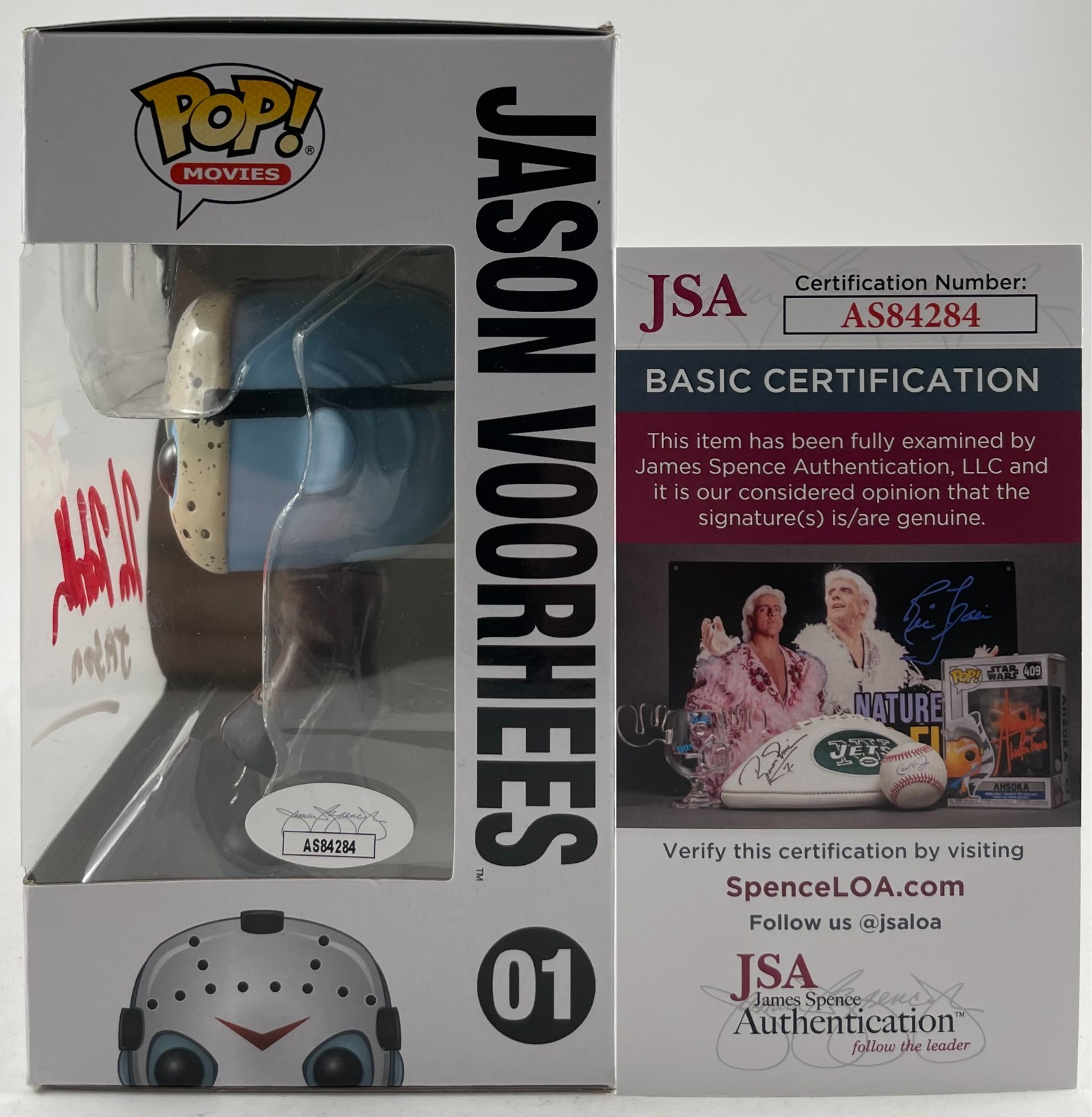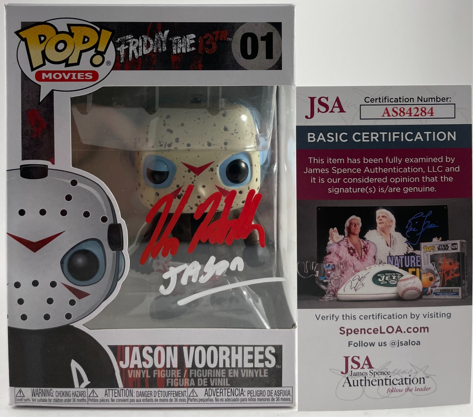 Friday The 13th Jason Voorhees Funko POP! Vinyl Figure #01, hand signed in person by Horror Icon, actor Kane Hodder who played the role of Jason Voorhees in Friday The 13th Parts VII, VIII, IX, and X. This is a clean, well placed signature, signed in a flowing Red 2MM Molotow Paint Pen that really pops off of the plastic. Kane also added the character name “Jason” inscription in a flowing White 2MM Molotow Paint Pen that really pops. The dual colors is a great touch that really makes this Funko POP! Vinyl Figure stand out from the other Funko’s out there. A clear plastic Eco-TEK Funko POP! protector is included with purchase to safely ship the Funko inside of. Item has been authenticated by James Spence Authentication, one of the most reputable third-party authentication companies in the world, and includes the JSA Certificate of Authenticity card.