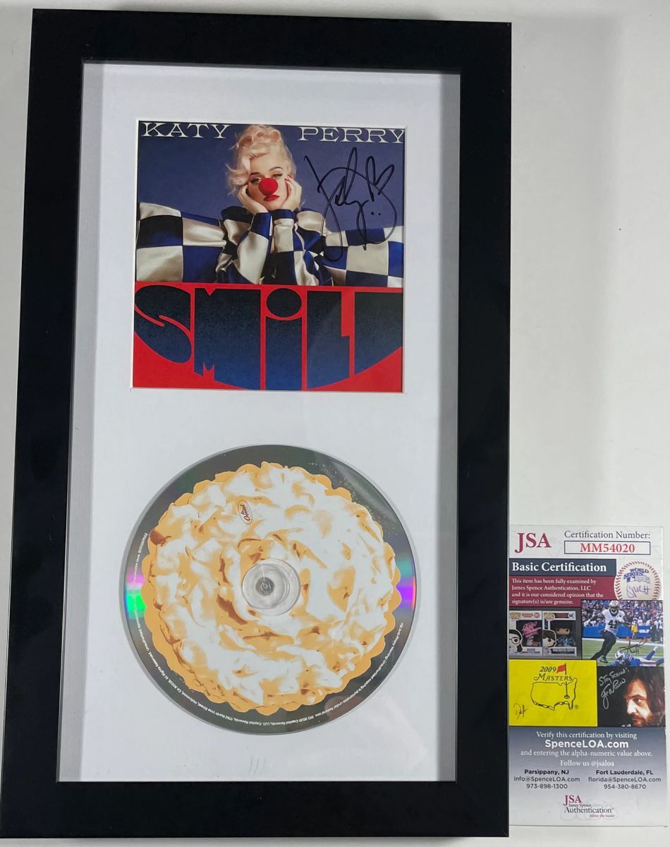 Katy Perry Smile CD Booklet, hand signed by talented singer-songwriter Katy Perry. This is a clean, well paced signature that really pops off of the signed CD booklet, inside of this amazing framed and matted display. Item has been authenticated by James Spence Authentications, and includes the JSA Certificate Of Authenticity card.