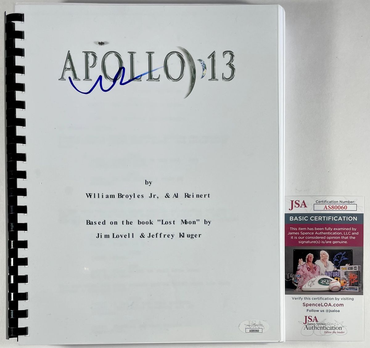 Professionally bound Apollo 13 complete movie script, hand signed in person by actor Kevin Bacon who played the role of Jack Swigert in the 1995 film Apollo 13. This is a clean, well placed signature, signed in a flowing Blue Sharpie that really pops off of the cover of this Apollo 13 full movie script. Script is complete, professionally bound and comes with a clear plastic protector. Clear on the front so you can display the script, and black on the back. Item has been authenticated by James Spence Authentications, one of the most reputable third-party authentication companies in the world and includes the JSA Certificate Of Authenticity card.