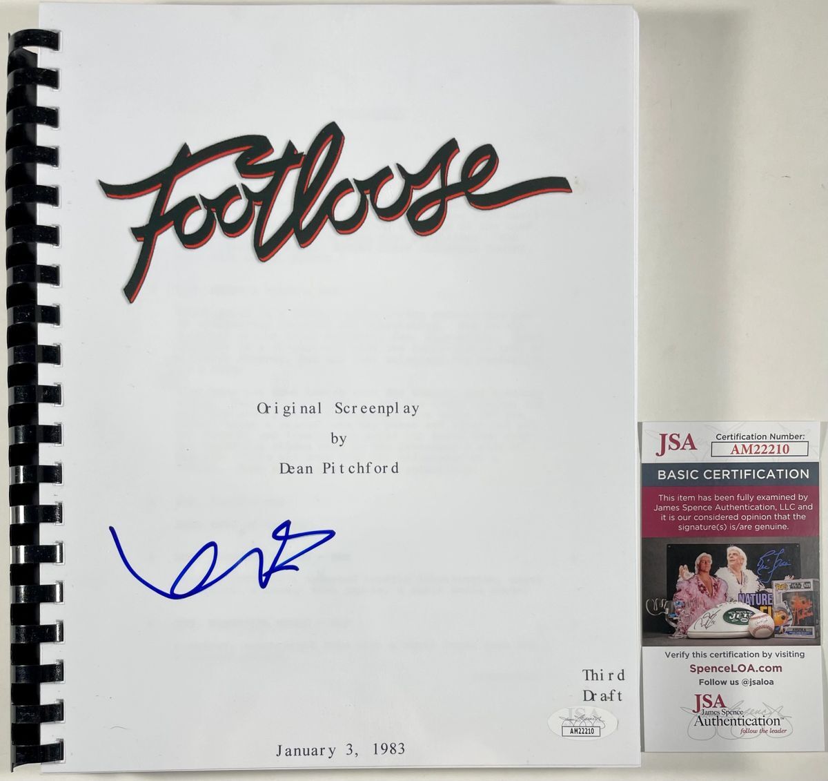 Professionally bound Footloose complete movie script, hand signed by actor Kevin Bacon who starred in the film as Ren. This is a clean, well placed signature that really pops off of the cover of this Footloose full movie script. Script is complete, professionally bound and comes with a clear plastic protector. Clear on the front so you can display the script, and black on the back. Item has been authenticated by James Spence Authentications, and includes the JSA Certificate Of Authenticity card. JSA COA# AM22210