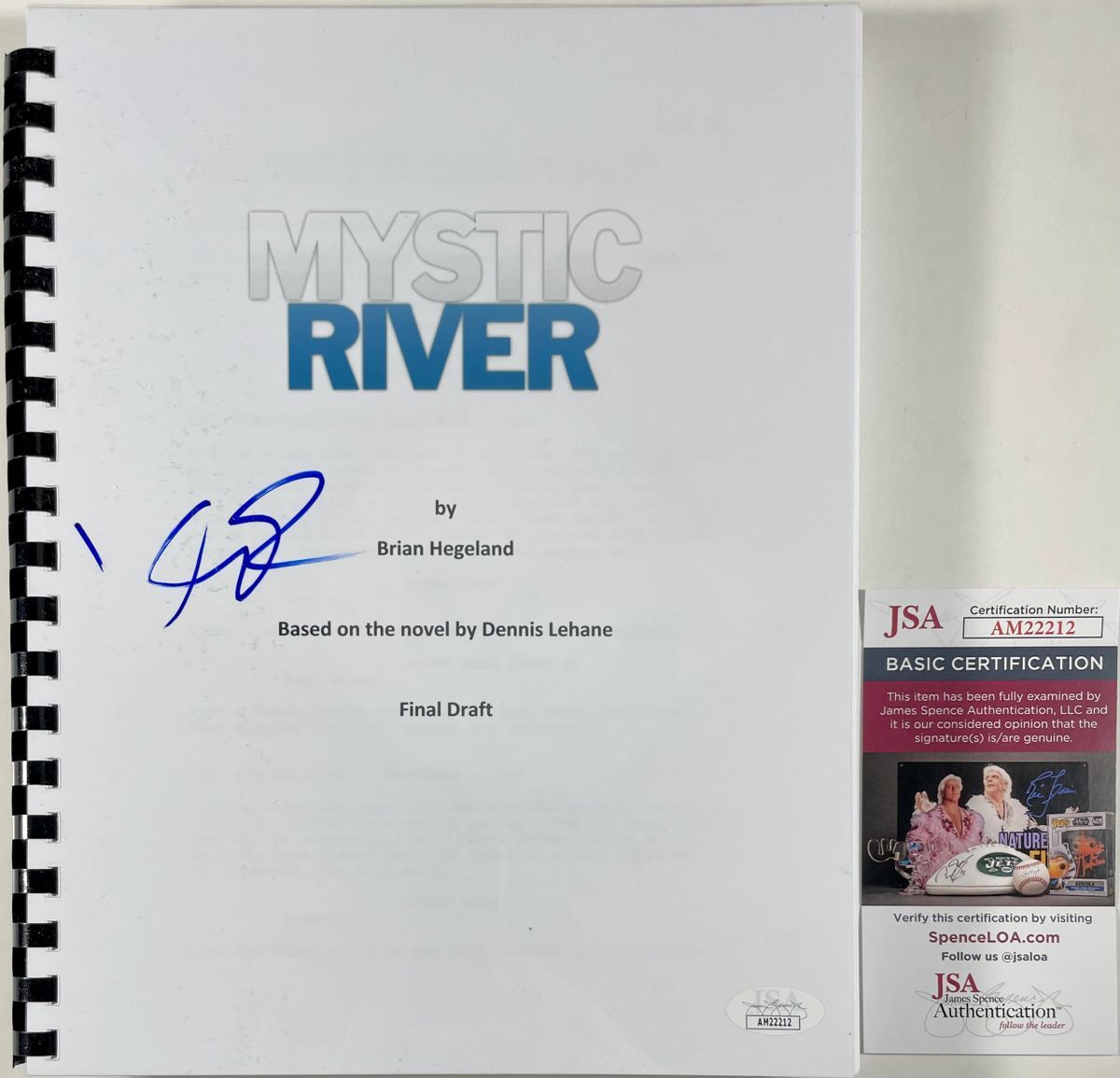 Professionally bound Mystic River complete movie script, hand signed by actor Kevin Bacon who played the role of Sean Devine in the film. This is a clean, well placed signature that really pops off of the cover of this Mystic River full movie script. Script is complete, professionally bound and comes with a clear plastic protector. Clear on the front so you can display the script, and black on the back. Item has been authenticated by James Spence Authentications, and includes the JSA Certificate Of Authenticity card. JSA COA# AM22212