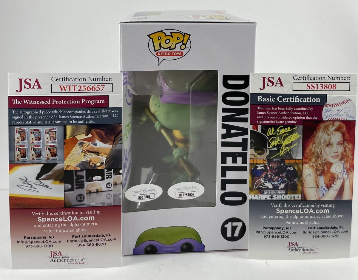Teenage Mutant Ninja Turtles Donatello Funko POP #17, dual signed by TMNT Creator Kevin Eastman and the original voice of Donatello, Barry Gordon. This is two clean, well placed signatures, that really pop off of the plastic. Kevin Eastman signed in a Green 2 MM Decco paint pen while drawing a Turtle Head Sketch in a Purple 2 MM Decco paint pen. Barry Gordon signed and wrote is character name “Donatello” in the same 2 MM Purple Decco paint pen. Item has been authenticated by James Spence Authentications, and includes the JSA Witness Certificate of Authenticity card for Mr. Eastman and JSA Basic COA card for Mr. Gordon. Kevin Eastman