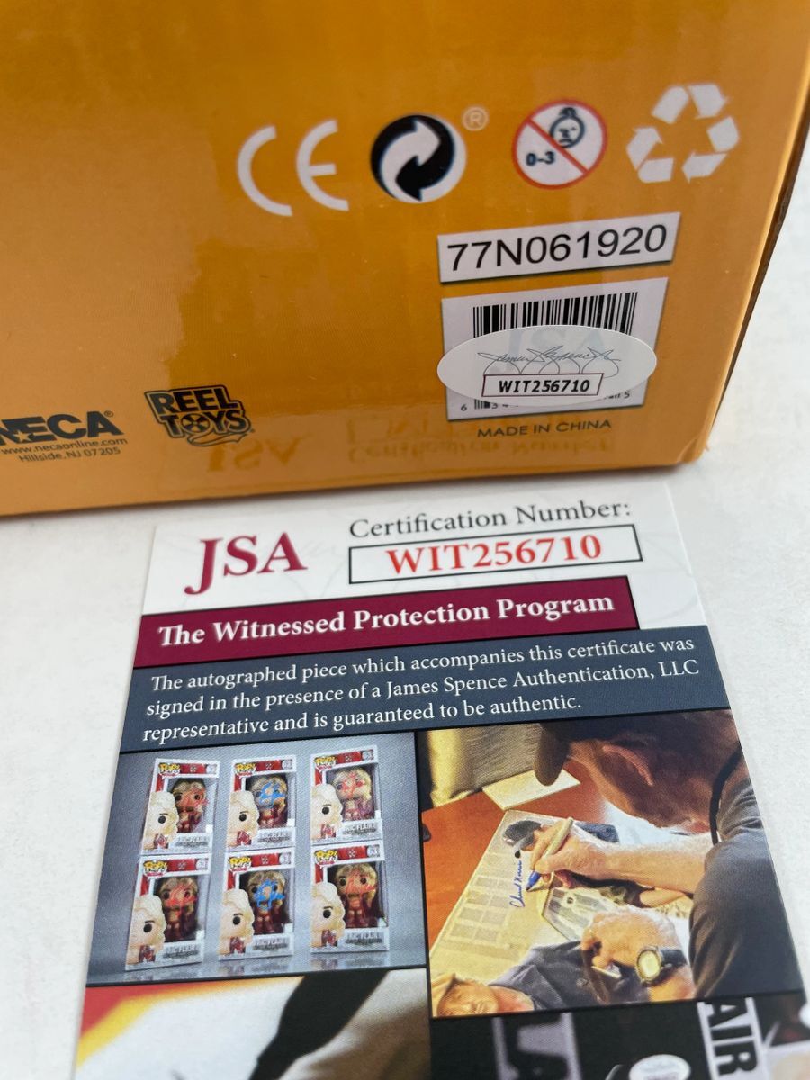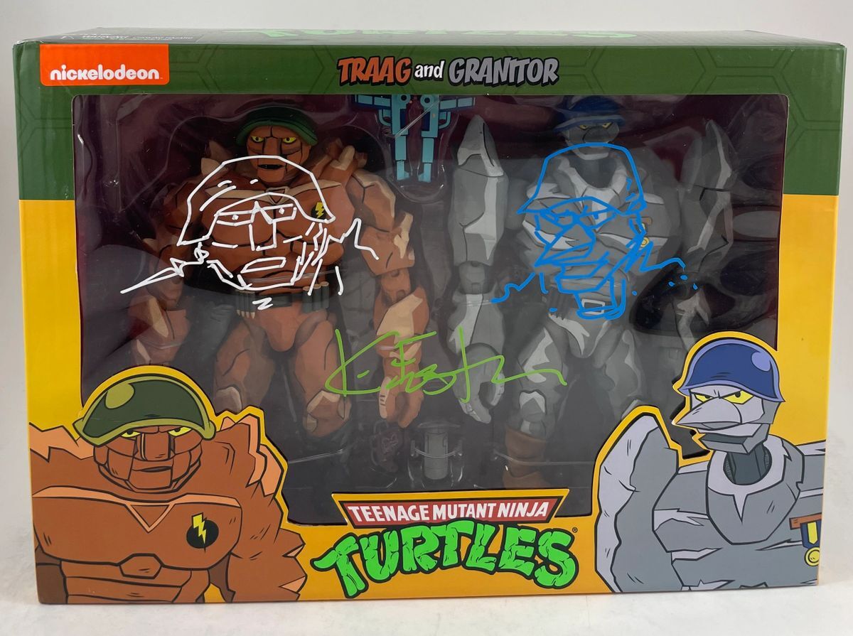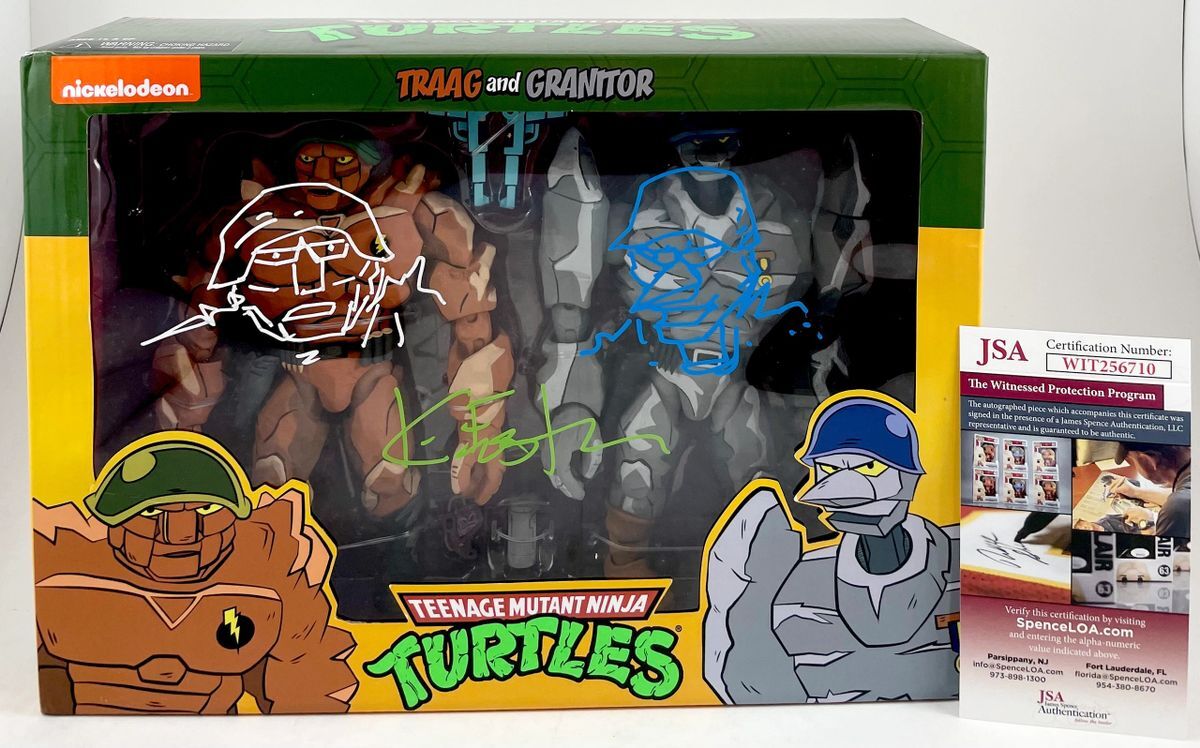 Teenage Mutant Ninja Turtles Traag and Granitor NECA 2 Figure Set, hand signed by TMNT Creator Kevin Eastman. This is a clean, well placed signature, signed in a Green 2 MM paint pen. Mr. Eastman added the dual sketches, including the Traag sketch in white paint and the Granitor sketch in blue paint. Multiple colors and a lot of love went in to this highly detailed collectible for the serious collector. Item was witnessed being signed by James Spence Authentications, and includes the JSA Witness Certificate of Authenticity card. JSA COA# WIT256710