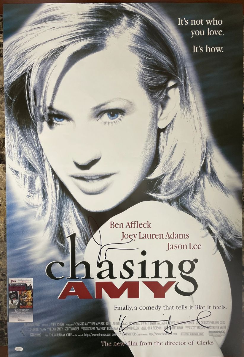 Chasing Amy 27×40 full size movie poster, dual signed by Writer/Director Kevin Smith and actor Jason Mewes who are known for playing the roles of Jay and Silent Bob in numerous films. In 2022, Kevin Smith has to be considered one of the truly great filmmakers of the last three decades, having written and directed such classics as Mallrats, Clerks, Jay and Silent Bob Strike Back, and Zack and Miri Make A Porno, and Chasing Amy just to name a few. This is two clean, well placed signatures that really pop off of this this Chasing Amy 27×40 full size movie poster. Item has been authenticated by James Spence Authentications, and includes the JSA Certificate of Authenticity Card.