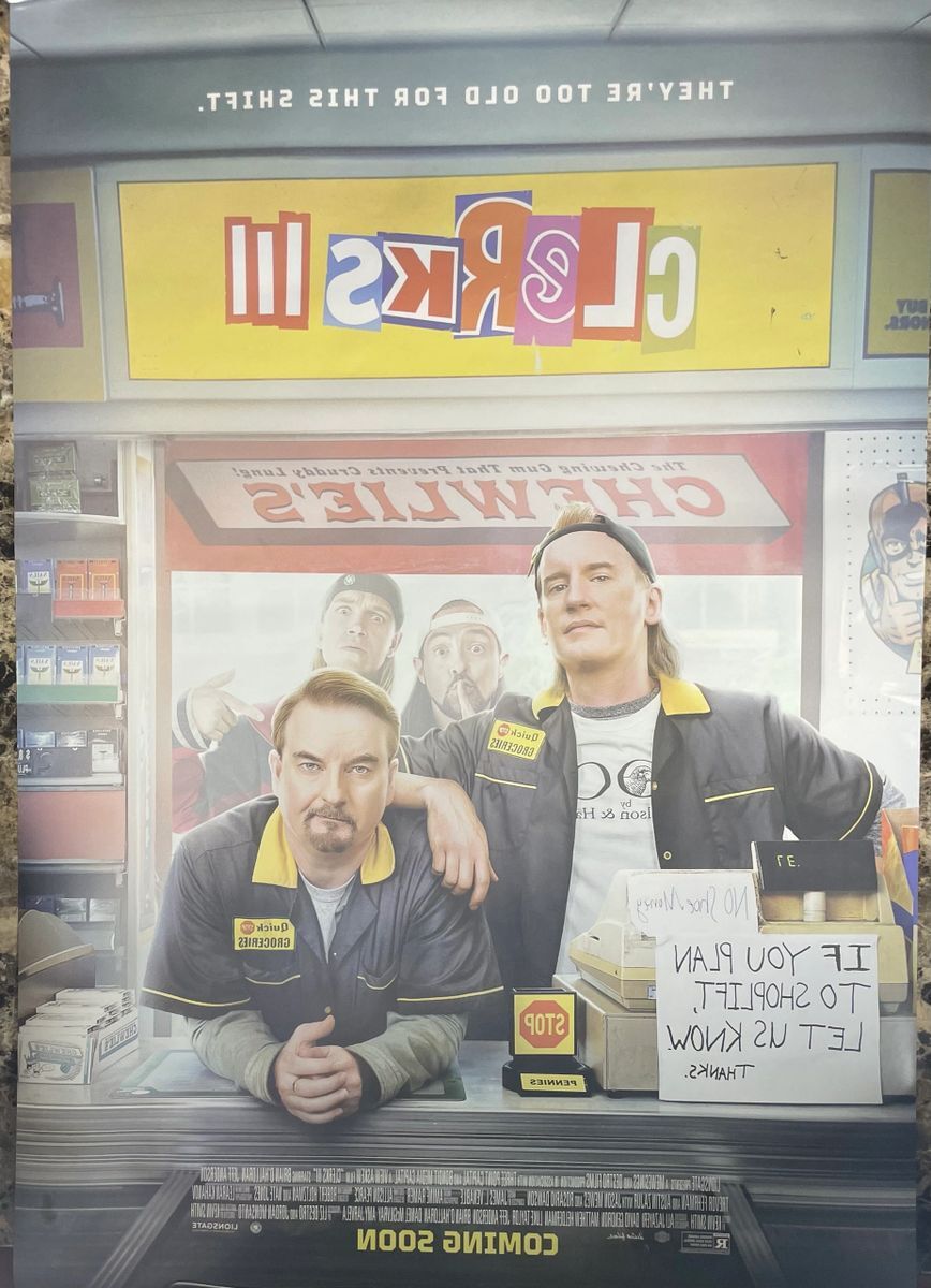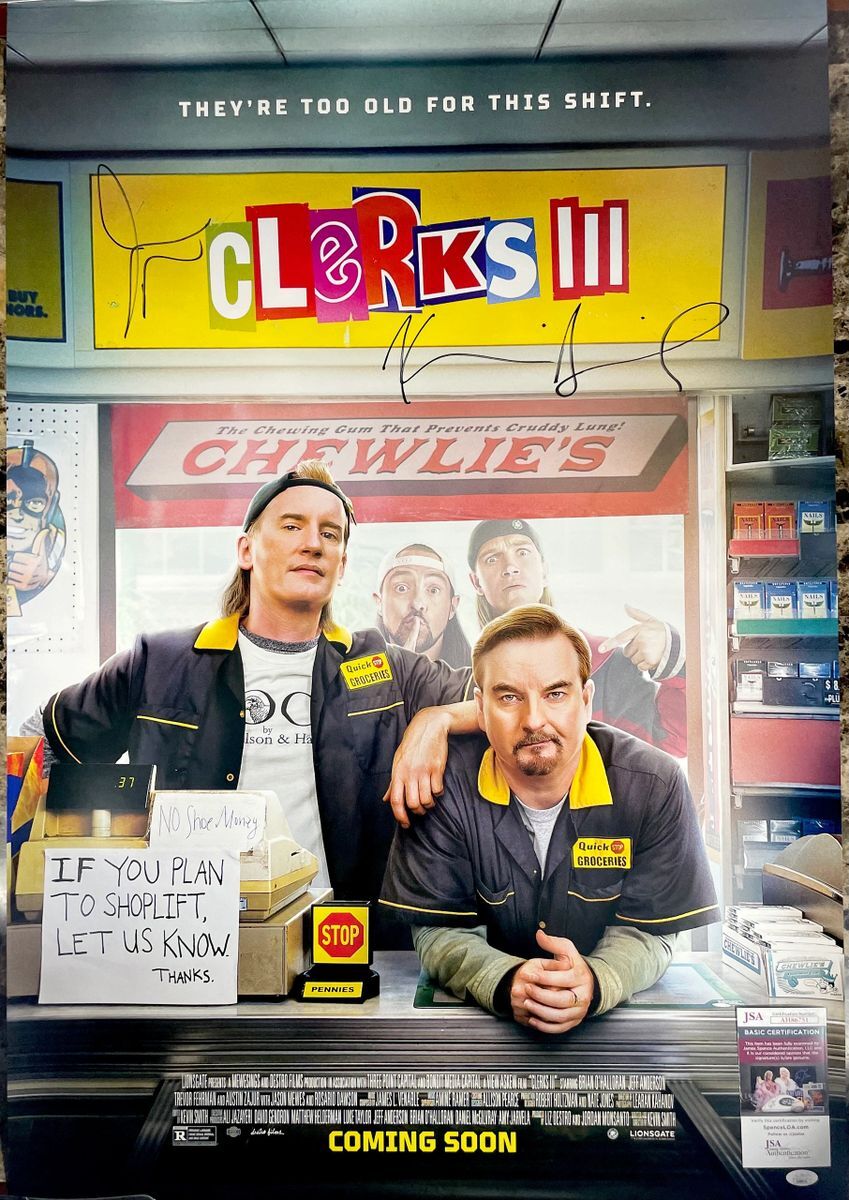 Clerks III 27×40 Full Size Double Sided Movie Poster, hand signed in person by actors Kevin Smith and Jason Mewes who played the roles of Jay and Silent Bob in all the Clerks films and numerous other Kevin Smith films. Not only does Kevin Smith play the role of Silent Bob, he also wrote and directed all three of the Clerks films, as well as Mallrats, Chasing Amy, Jay and Silent Bob Strike Back, Dogma, and many other classic films of the past few decades. This is two clean, well placed signatures, that really pop off of this this Clerks III 27×40 Full Size Double Sided Movie poster. Item has been authenticated by James Spence Authentications, one of the most reputable third party authentication companies in the world, and includes the JSA Certificate of Authenticity Card. JSA COA# AH86751
