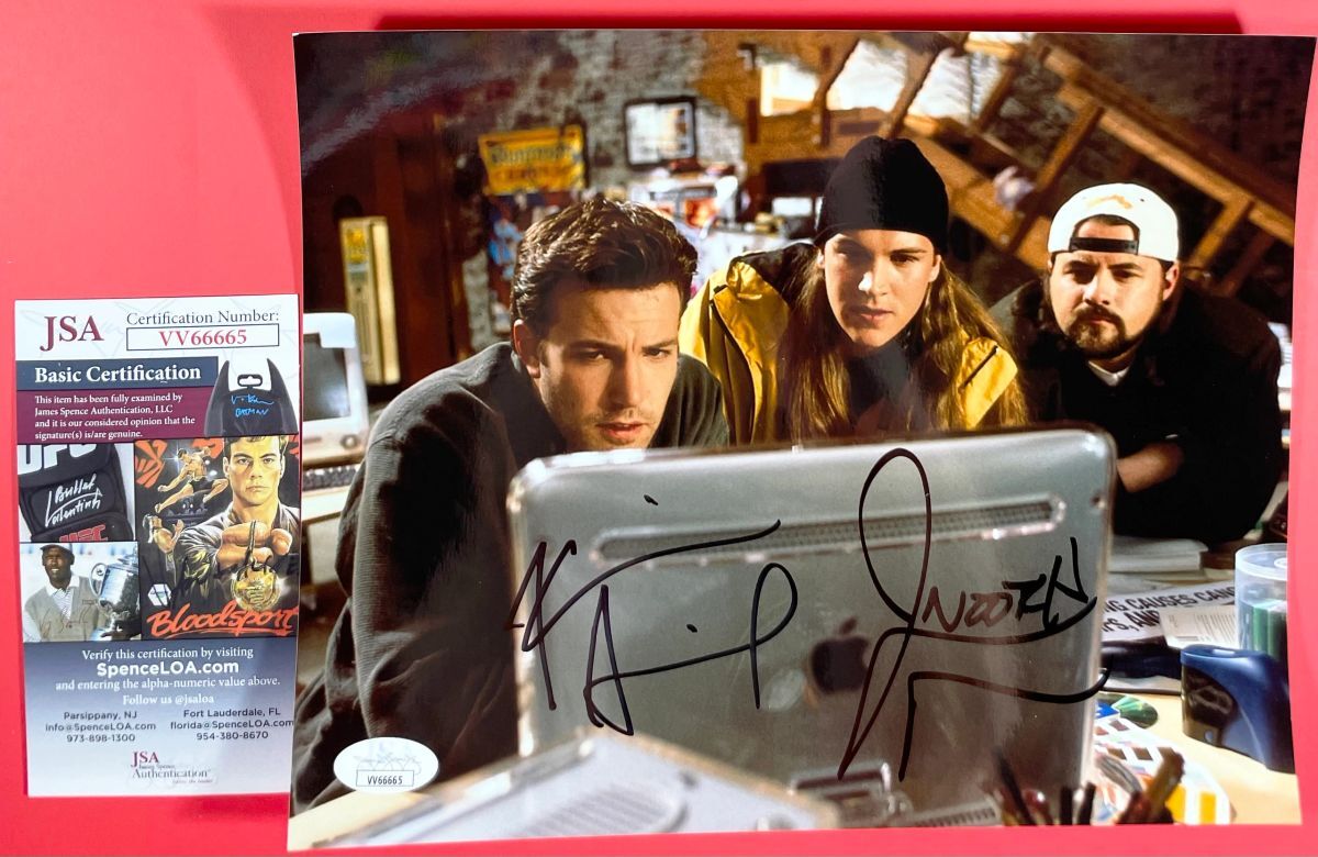 Professionally printed 8×10 photo, dual signed by actors Kevin Smith and Jason Mewes who play the roles of Jay and Silent Bob in Jay and Silent Bob Strike Back and numerous other Kevin Smith classics. Kevin Smith also wrote and directed the Jay and Silent Bob films, as well as the Clerks films, Dogma, and Chasing Amy just to name a few. This is two clean, well placed signatures, that really pop off of this crisp, professionally printed 8×10 photo. Item has been authenticated by James Spence Authentications, and includes the JSA Certificate of Authenticity Card.