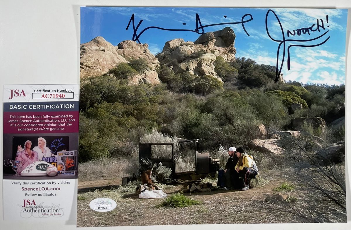 Professionally printed 8×10 photo, dual signed by actors Kevin Smith and Jason Mewes who play the roles of Jay and Silent Bob in Jay and Silent Bob Strike Back and numerous other Kevin Smith classics. Kevin Smith also wrote and directed the Jay and Silent Bob films, as well as the Clerks films, Dogma, and Chasing Amy just to name a few. This is two clean, well placed signatures, that really pop off of this crisp, professionally printed 8×10 photo. Item has been authenticated by James Spence Authentications, and includes the JSA Certificate of Authenticity Card.