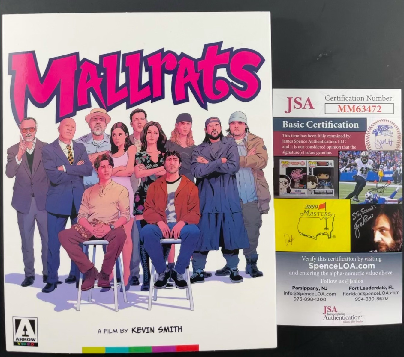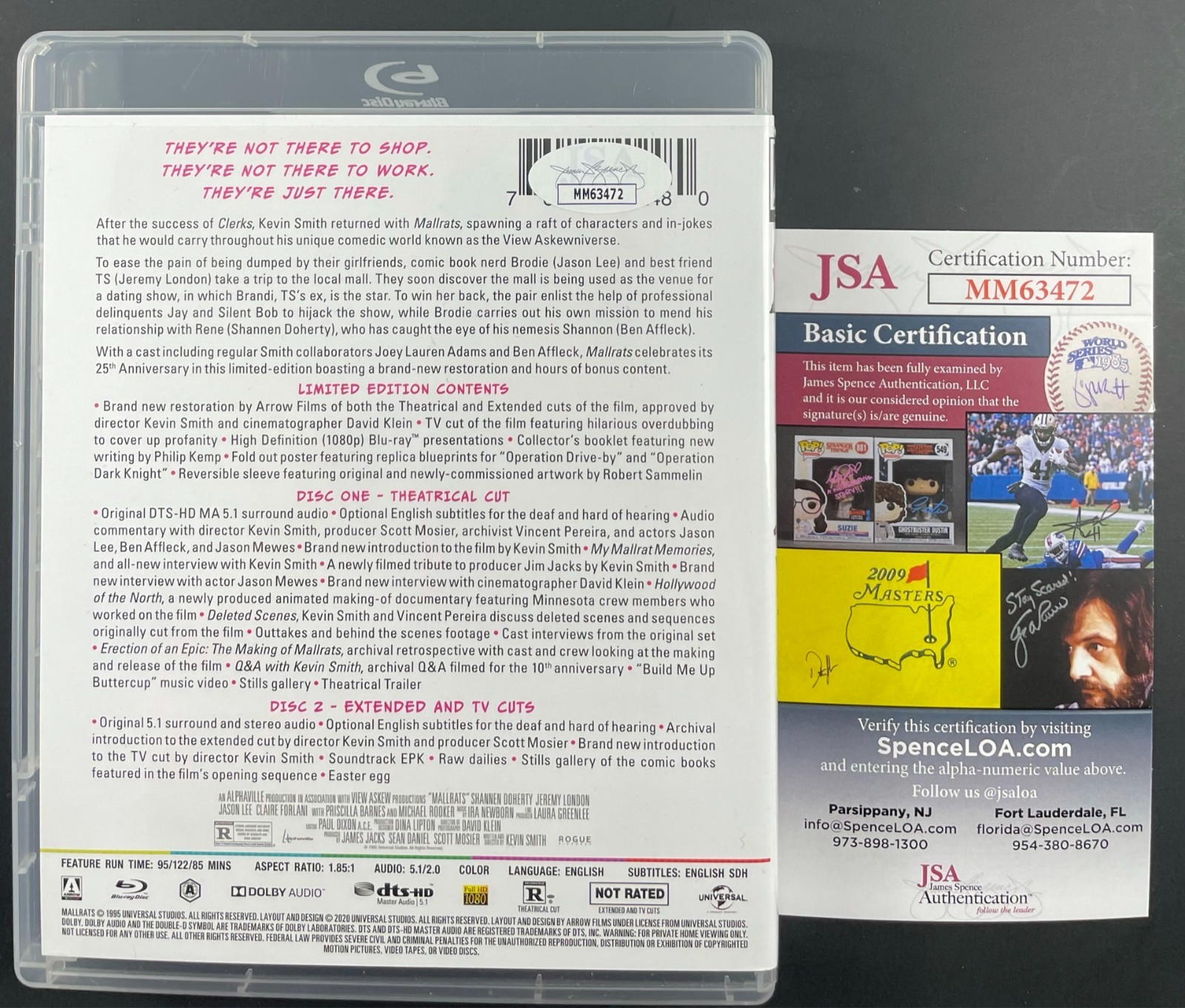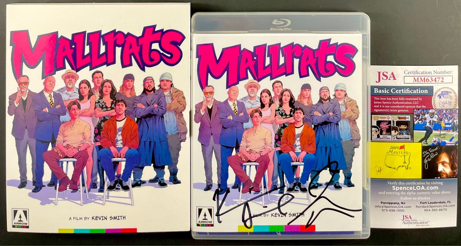 Mallrats Extended Cut and Theatrical Release Blu-Ray with collectible cover art, hand signed in person by actor Jason Mewes and multi-talented Actor, Writer, and Director Kevin Smith who wrote, directed, and starred in the 1995 film Mallrats. Together Jason and Kevin have played the roles of Jay and Silent Bob as well as Bluntman and Chronic in a number of Kevin;s films as Kevin Smith has written and directed numerous other classic films over the last three decades, including Dogma, Chasing Amy, Jay & Silent Bob Strike Back, and the Clerks films just to name a few. This is two clean, well placed signatures, signed in a matching, flowing Black Sharpie that really pops off of this Mallrats Blu-Ray Collectible Variant Cover. Item has been authenticated by James Spence Authentication, one of the most reputable third-party authentication companies in the world, and includes the JSA Certificate of Authenticity card.