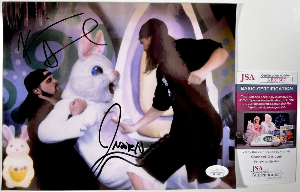 Professionally printed 8×10 photo, dual signed by actors Kevin Smith and Jason Mewes who play the roles of Jay and Silent Bob in Mallrats and numerous other Kevin Smith classics. Kevin Smith also wrote and directed the Jay and Silent Bob films, as well as the Clerks films, Dogma, and Chasing Amy just to name a few. This is two clean, well placed signatures, that really pop off of this crisp, professionally printed 8×10 photo. Item has been authenticated by James Spence Authentications, and includes the JSA Certificate of Authenticity Card. JSA COA# AB55507