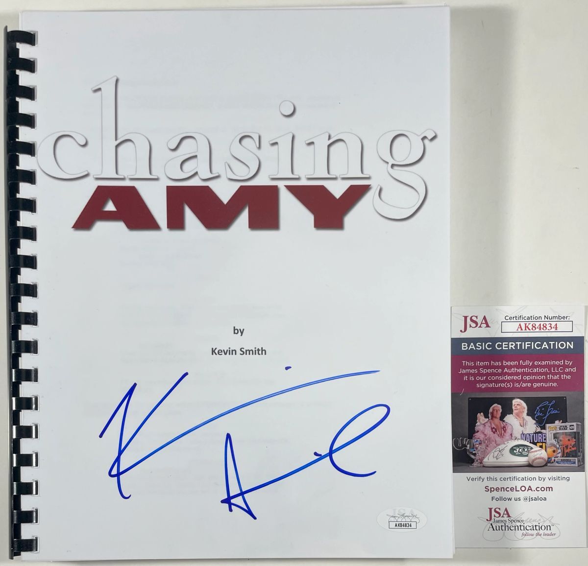 Professionally bound Chasing Amy complete movie script, hand signed in person by multi talented actor, writer and Director Kevin Smith who not only wrote and directed the film, but played the role of Silent Bob as well. Outside of his minimal roles and work as Silent Bob of Jay & Silent Bob fame, Kevin Smith is likely best known for writing and directing such films as Mallrats, the Clerks films, Dogma, the Jay And Silent Bob films, and Chasing Amy just to name a few. This is a clean, well placed signature that really pops off of the cover of this Chasing Amy full movie script. Script is complete, professionally bound and comes with a clear plastic protector. Clear on the front so you can display the script, and black on the back. Item has been authenticated by James Spence Authentications, and includes the JSA Certificate Of Authenticity card. JSA COA# AK84834