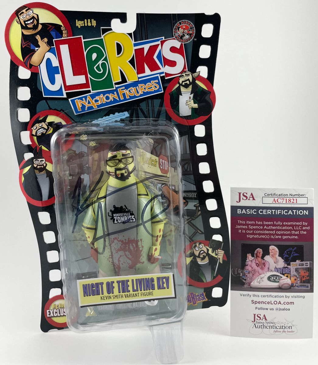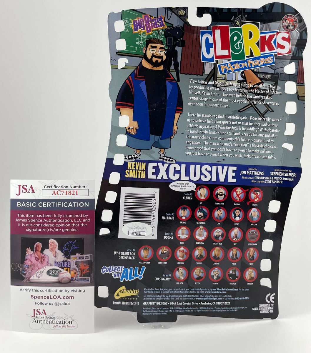 Graphitti Designs Big Blast Clerks Inaction Big Bucks Exclusive Night Of The Living Kev Kevin Smith Variant Figure, hand signed by multi talented actor, writer, and director Kevin Smith. Kevin wrote, directed, and played a role in Clerks, among many other films over the last three decades including Mallrats, Chasing Amy, Dogma, Jay and Silent Bob Strike Back, and Zack and Miri Make a Porno just to name a few. This is a clean, well placed signature that really pops off of the plastic. There are minor flaws to the card backing, however figure displays awesome as you can see in the photos, Item has been authenticated by James Spence Authentications, and includes the JSA Certificate of Authenticity card.