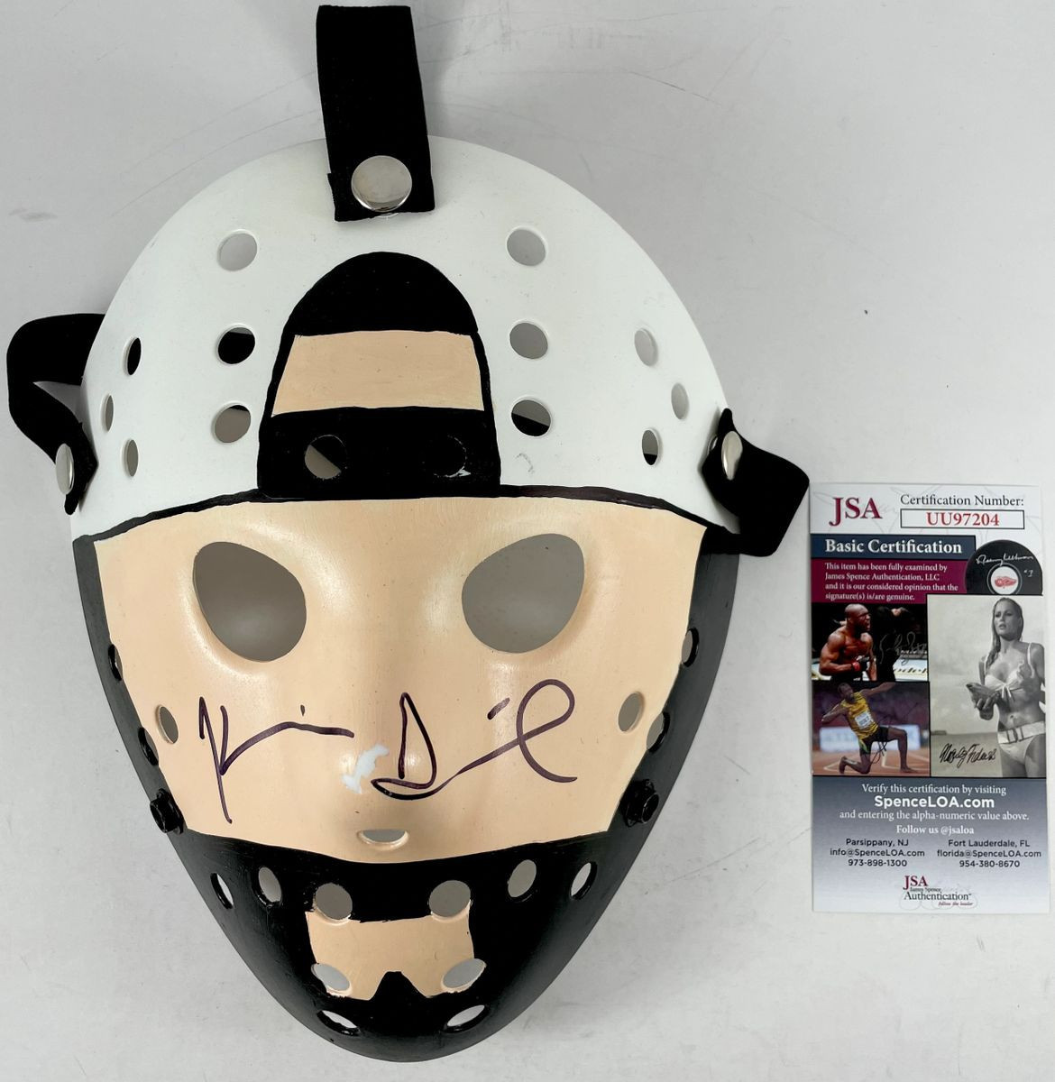 Jay and Silent Bob, Silent Bob 13X Hockey Mask, hand signed in person by multi-talented Writer, Director, and actor Kevin Smith who wrote, directed, and played the role of Silent Bob in numerous films including Mallrats, Jay and Silent Bob Strike Back, Chasing Amy, Dogma, the Clerks films among others. This is a clean, well placed signature, signed in a flowing Black Sharpie that really pops off of this Silent Bob 13X Hockey Mask. Please make note of the light paint chipping on the tip of the nose. Item has been authenticated by James Spence Authentications, one of the most reputable third-party authentication companies in the world and includes the JSA Certificate Of Authenticity card.