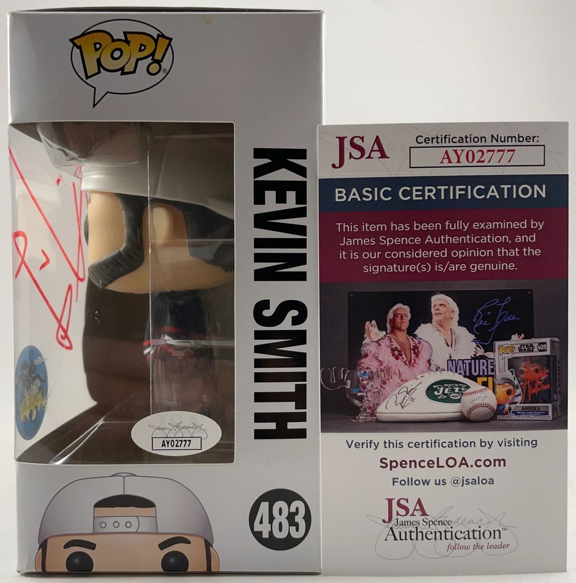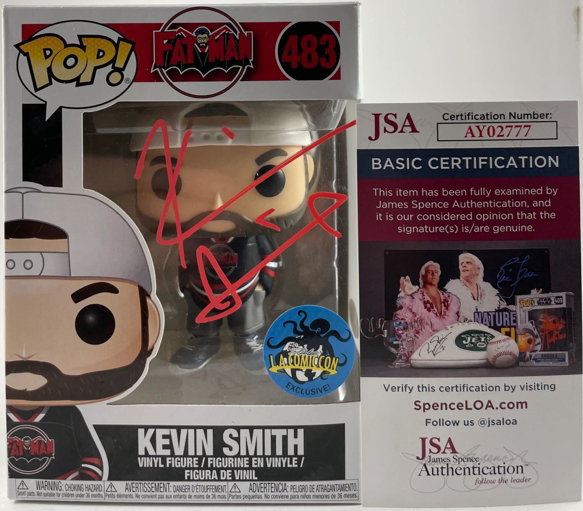 Jay & Silent Bob Fat Man LA ComiCon Exclusive Funko POP #483, hand signed in person by multi talented actor, writer, and director Kevin Smith. This is a clean, well placed signature, signed in a flowing Red 2 MM Molotow paint pen that really pops off of the plastic. Item has been authenticated by James Spence Authentications, one of the most reputable third party authentication companies in the world, and includes the JSA Certificate of Authenticity card. JSA COA# AY02777