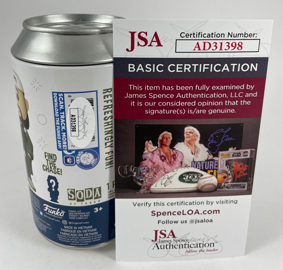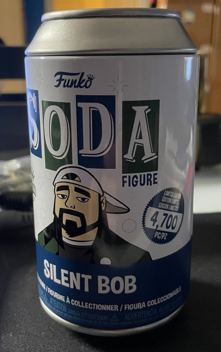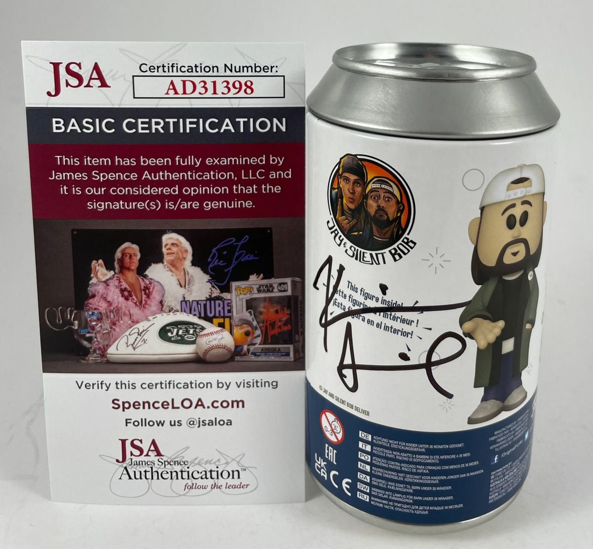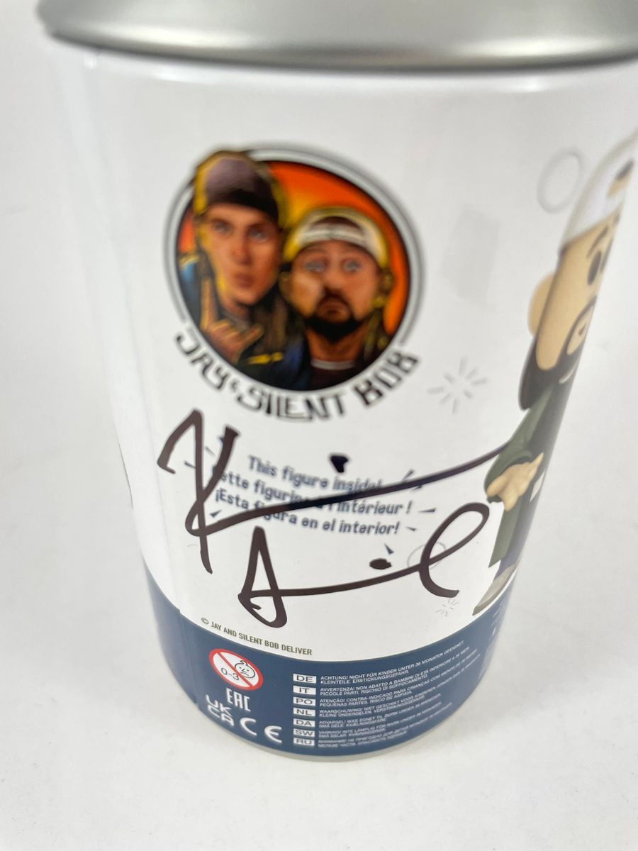 Jay and Silent Bob Limited Edition 4,700 Piece Funko SODA Can Silent Bob Figure, hand signed in person by multi-talented actor, writer, and director Kevin Smith who not only plays the role of Silent Bob, he also wrote and directed many classic films of our generation including Clerks, Mallrats, Jersey Girl, Chasing Amy, Dogma, and Zack and Miri Make a Porno just to name a few. This Limited Edition Funko SODA Can was limited to 4,700 pieces, however this is the Silent Bob With Gas Mask 1 of 775 Chase Variant. This is a clean, well placed signature, signed in a flowing Black Sharpie that really pops off of this rare, highly collectible Funko SODA can. Item has been authenticated by James Spence Authentications, one of the most reputable third-party authentication companies in the world and includes the JSA Certificate of Authenticity card.