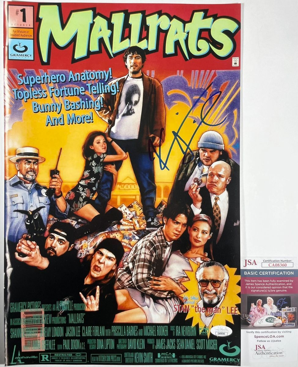Professionally printed Mallrats 11×17 movie poster, hand signed in person by multi-talented Actor, Writer, and Director Kevin Smith who wrote, directed, and starred in the 1995 film Mallrats. Kevin Smith has also written and directed numerous other classic films over the last three decades including Dogma, Chasing Amy, Jay & Silent Bob Strike Back, and the Clerks films just to name a few. This is a clean, well placed signature, signed in a flowing Blue Sharpie that really pops off of this crisp, professionally printed Mallrats 11×17 movie poster. Item has been authenticated by James Spence Authentications, one of the most reputable third-party authentication companies in the world and includes the JSA Certificate of Authenticity Card. JSA COA# CA08360