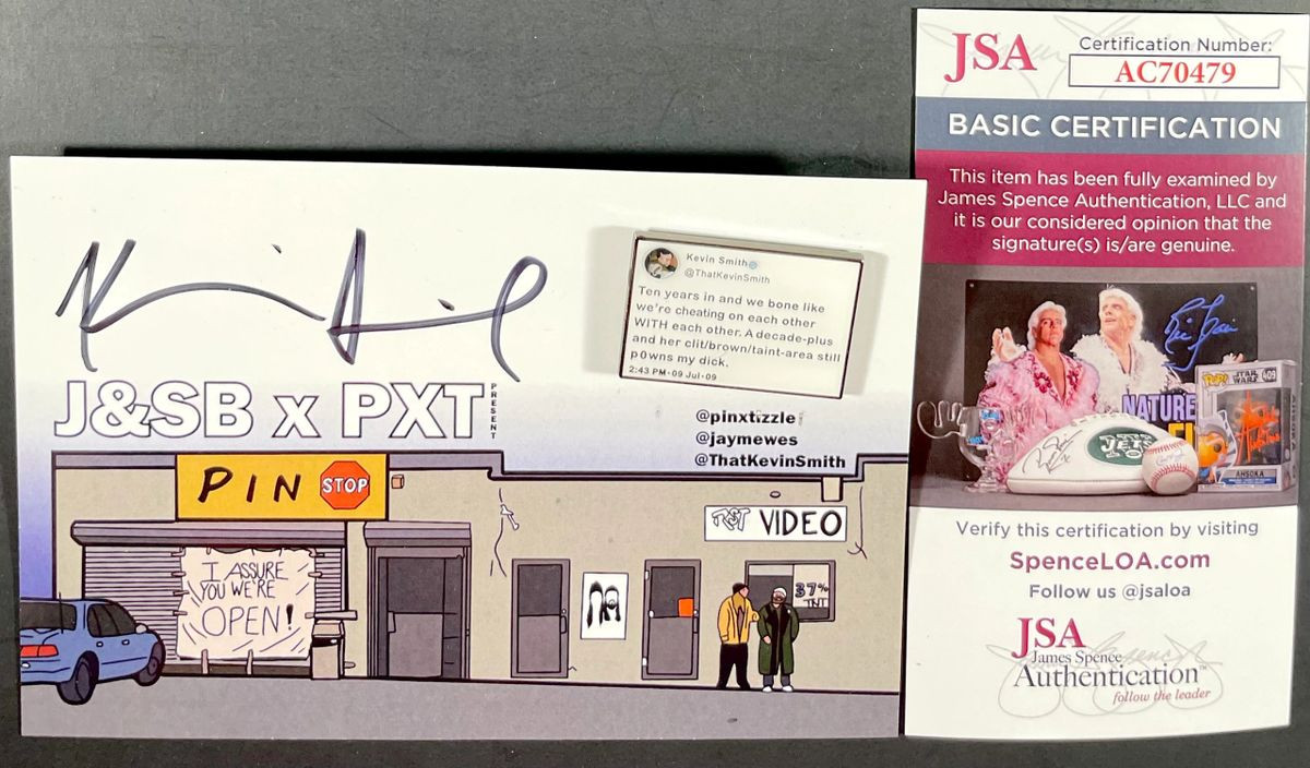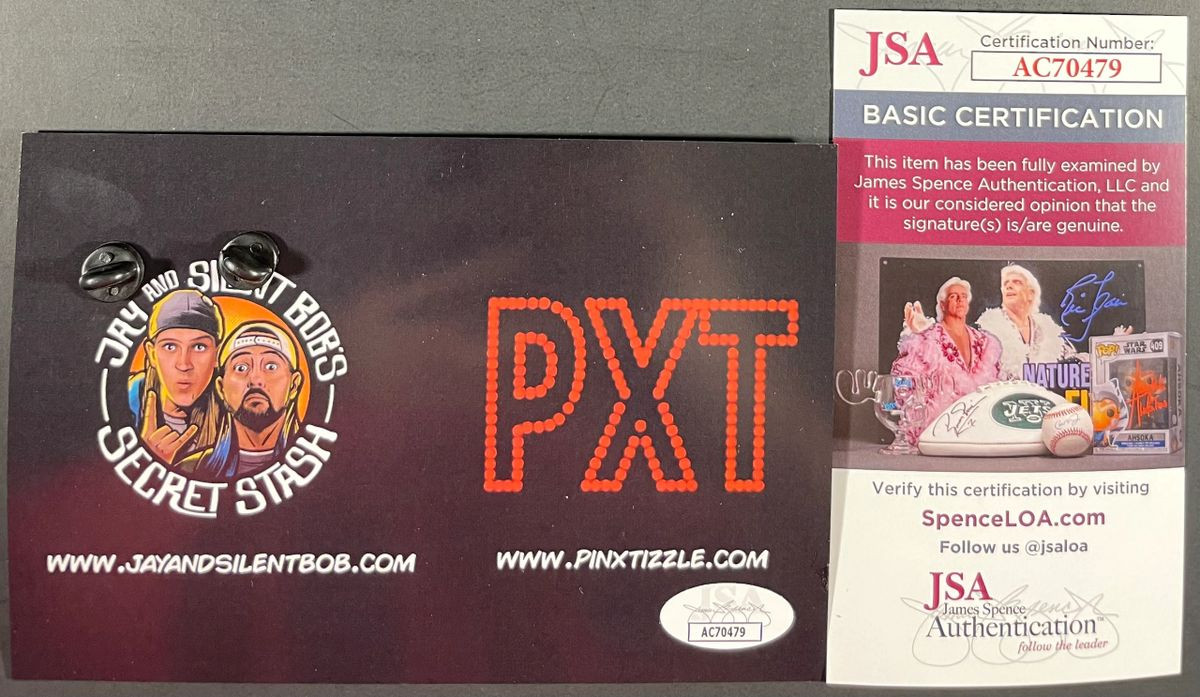 Jay and Silent Bob Pin Stop Drop 2 The Tweet Limited Edition Collectible Pin, hand signed in person by multi-talented actor, writer, and director Kevin Smith who has written and directed such films as the Clerks films, Mallrats, Jay and Silent Bob Strike Back, Casing Amy, Jersey Girl, and Dogma just to name a few. This pin was limited to only 137 made. This is a clean, well placed signature, signed in a flowing Black Sharpie that really pops off of this Pin Stop cardstock pin backing. Item has been authenticated by James Spence Authentications, one of the most reputable third-party authentication companies in the world and includes the JSA Certificate Of Authenticity card.