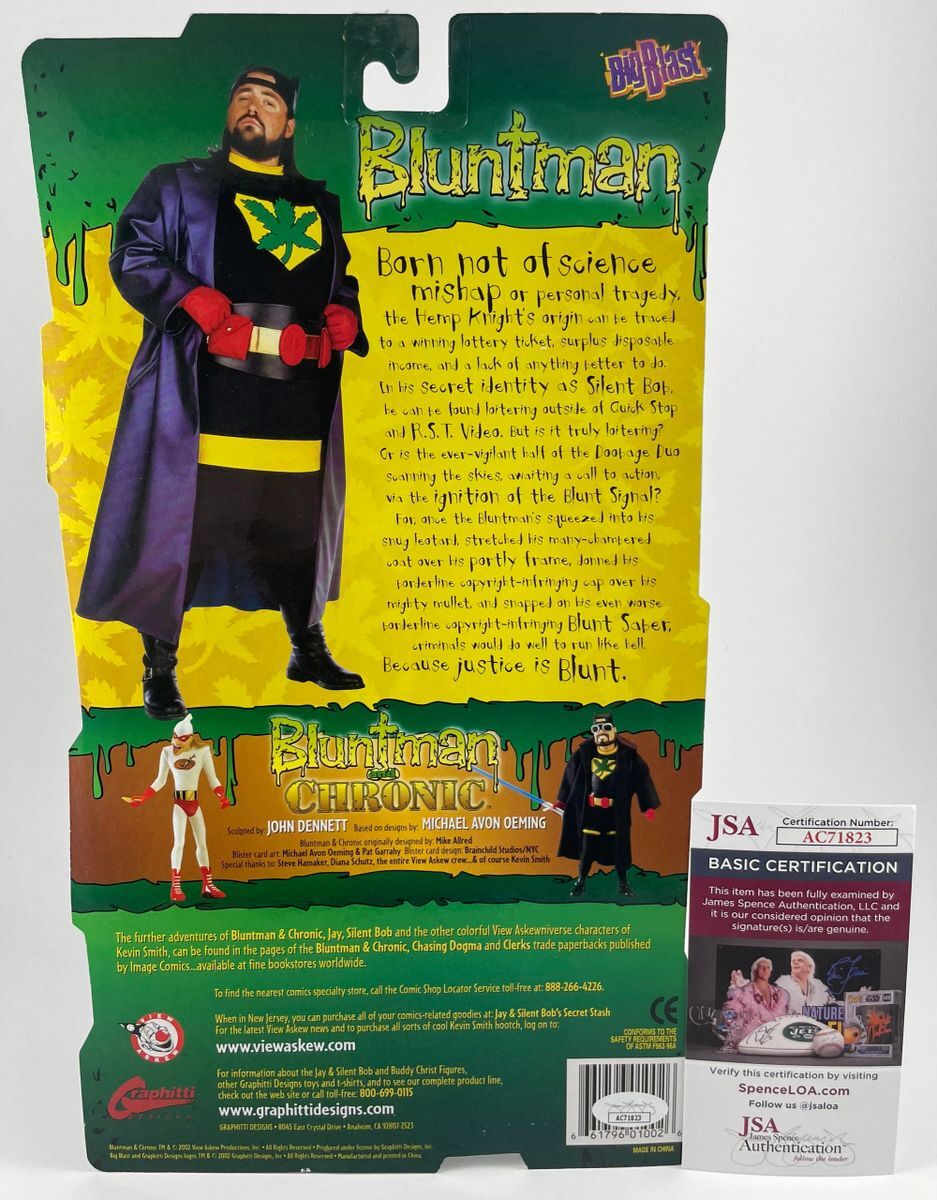 Graphitti Designs Big Blast View Askew Bluntman And Chronic Bluntman Figure, hand signed by multi talented actor, writer, and director Kevin Smith. Kevin wrote, directed, and played a role in Clerks, among many other films over the last three decades including Mallrats, Chasing Amy, Dogma, Jay and Silent Bob Strike Back, and Zack and Miri Make a Porno just to name a few. This is a clean, perfectly placed signature, signed in a flowing Purple paint pen that really pops off of the plastic. Item has been authenticated by James Spence Authentications, and includes the JSA Certificate of Authenticity card.