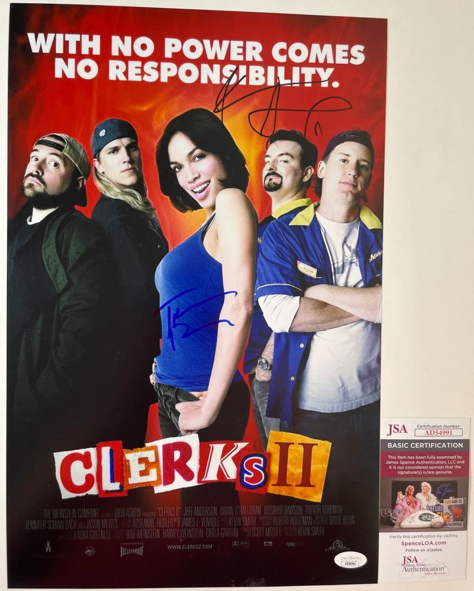 Professionally printed Clerks II 11×17 movie poster, dual signed by actors Kevin Smith and Trevor Fehrman who played the roles of Silent Bob and Elias in Clerks II and numerous other films. Not only does Kevin Smith play the role of Silent Bob, he also wrote and directed Clerks 1 and 2, as well as Mallrats, Chasing Amy, Jay and Silent Bob Strike Back, Dogma, and many other classic films of the past few decades. This is two clean, well placed signatures, that really pop off of this crisp, professionally printed Clerks II 11×17 movie poster. Item has been authenticated by James Spence Authentications, and includes the JSA Certificate of Authenticity Card. JSA COA# AD54991