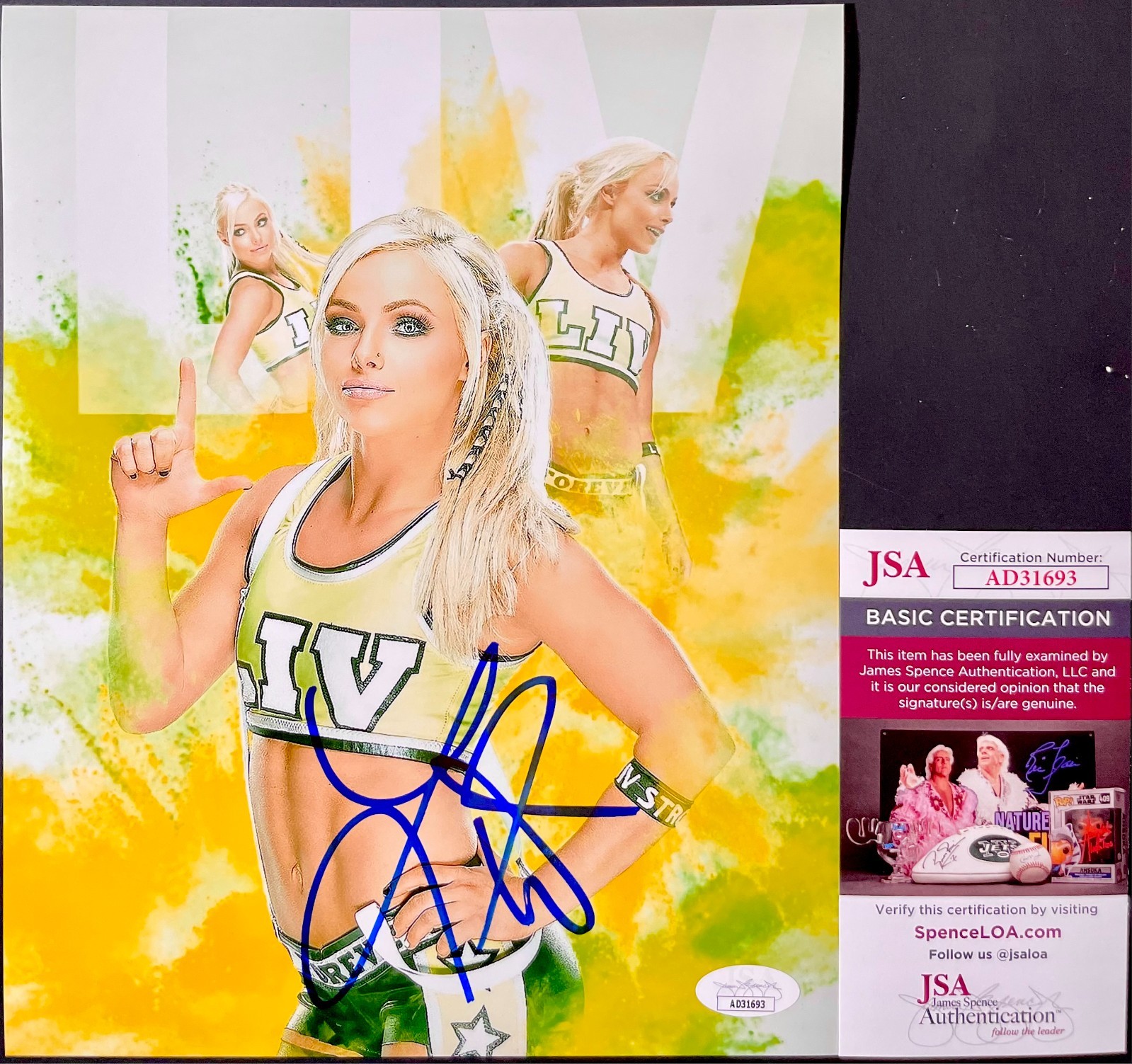 Professionally printed Custom Edit 8×10 Photo, hand signed in person by two-time WWE Women’s World Champion, and the 2022 WWE Women’s Money In The Bank (MITB) winner, the adorable Liv Morgan of the Judgment Day faction. Liv began her career in WWE as an original member of the Riott Squad. This is a clean, well placed signature, signed in a flowing Blue Sharpie that really pops off of this crisp, professionally printed Custom Edit 8×10 Photo. A clear plastic 8×10 toploader is included with purchase to safely ship the photo inside of. Item has been authenticated by James Spence Authentication, one of the most reputable third-party authentication companies in the world, and includes the JSA Certificate Of Authenticity card.