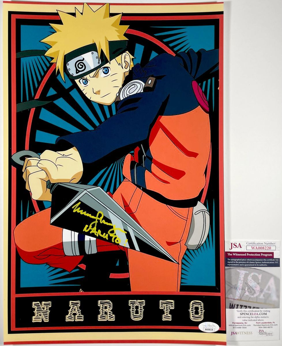Professionally printed 11×17 photo, hand signed in person by voice actress Maile Flanagan who is credited as the voice of Naruto in the widely popular series Naruto Shippuden. This is a clean, well placed signature with character name “Naruto” inscription that really pops off of this crisp, professionally printed 11×17 photo. Item was witnessed being signed by James Spence Authentications, one of the most reputable third party authentication companies in the world, and includes the JSA Witness Certificate of Authenticity card. JSA COA# WA008220