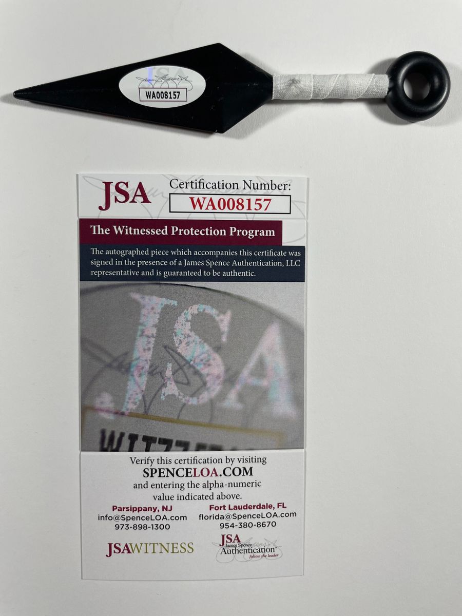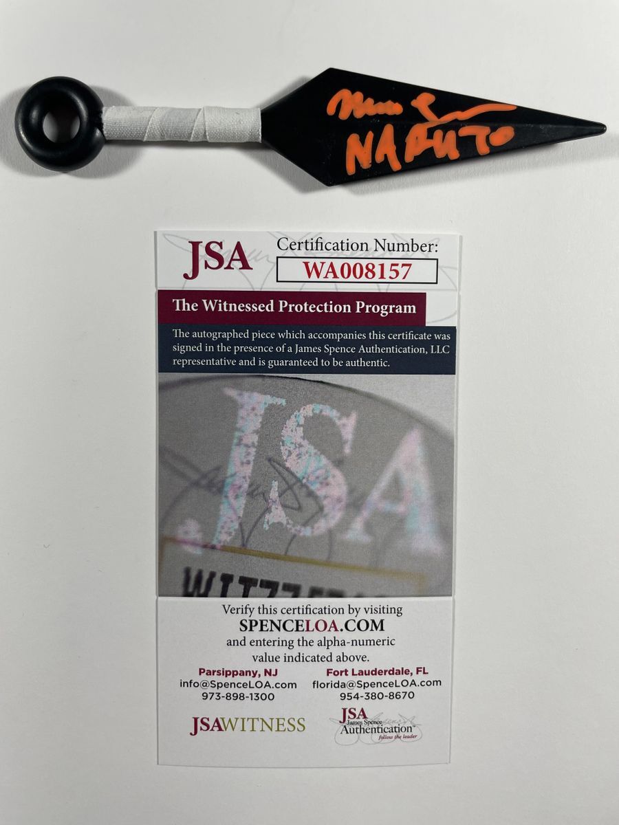 5″ Kunai Knife, hand signed by voice actor Maile Flanagan who is the voice of Naruto on the hit Naruto Shippuden show and films. This is a clean, perfectly placed signature, with character name “Naruto” inscription signed in a flowing Orange 2MM Molotow paint pen that really pops off of the plastic. Item was witnessed being signed by James Spence Authentications, and includes the JSA Witness Certificate of Authenticity card.