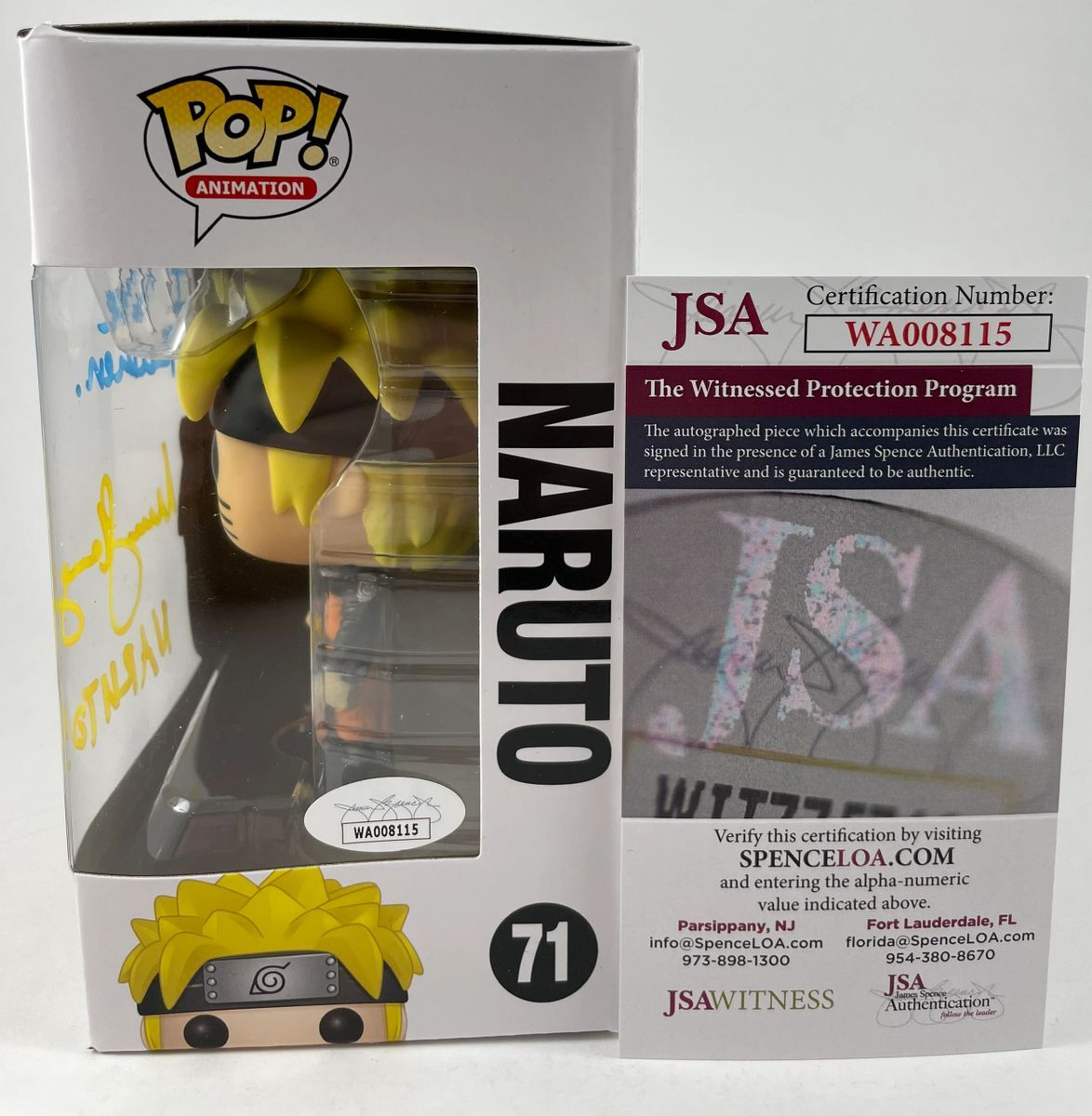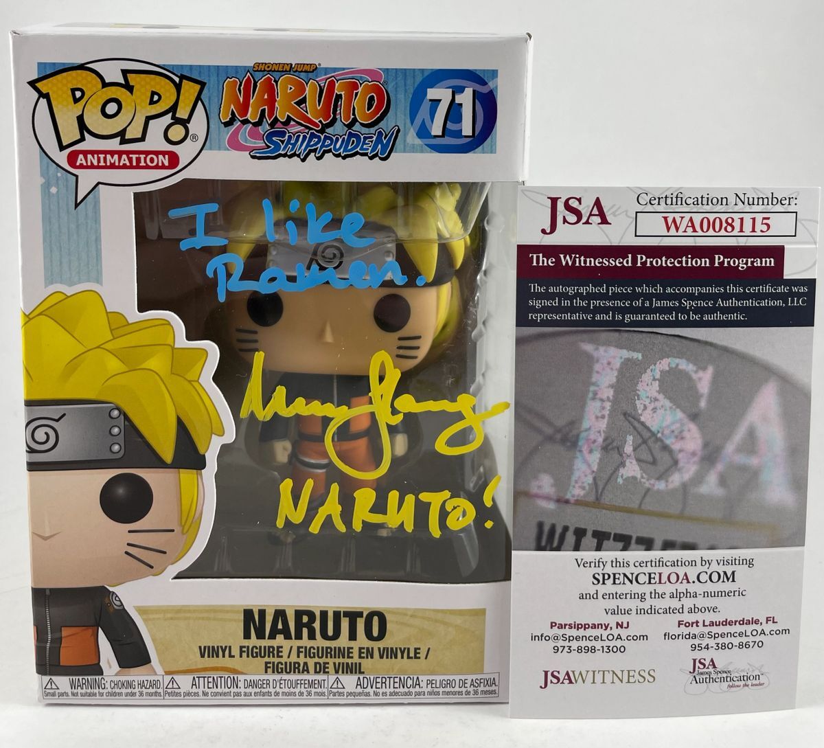Naruto Shippuden Naruto Funko POP #71, hand signed by voice actor Maile Flanagan who is the voice of Naruto. This is a clean, perfectly placed signature, with character name “Naruto” inscription signed in a flowing Yellow 2MM Molotow paint pen that really pops off of the plastic. Maile also added the “I like Ramen” inscription in a flowing Blue Molotow paint pen. The dual colors is a nice touch that really makes this POP stand out. Item was witnessed being signed by James Spence Authentications, and includes the JSA Witness Certificate of Authenticity card. JSA COA# WA008115