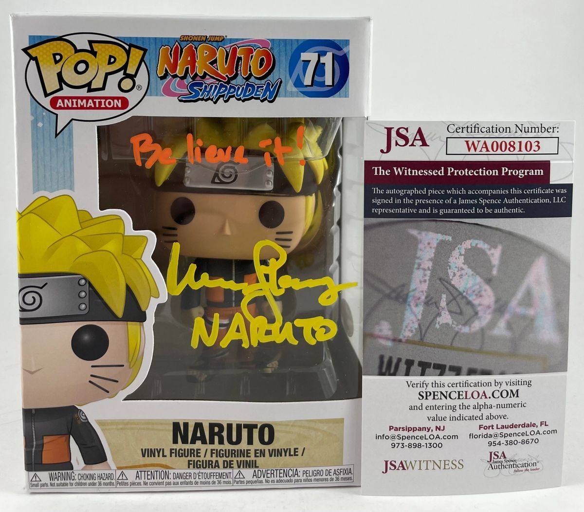Naruto Shippuden Naruto Funko POP #71, hand signed in person by voice actor Maile Flanagan who is credited as the voice of Naruto. This is a clean, perfectly placed signature, with character name “Naruto” inscription, signed in a flowing Yellow 2MM Molotow paint pen that really pops off of the plastic. Maile also added the “Believe It!” inscription in a flowing Orange Molotow paint pen. The dual colors is a nice touch that really makes this Funko POP stand out from the rest out there. Item was witnessed being signed by James Spence Authentications, and includes the JSA Witness Certificate of Authenticity card. JSA COA# WA008103