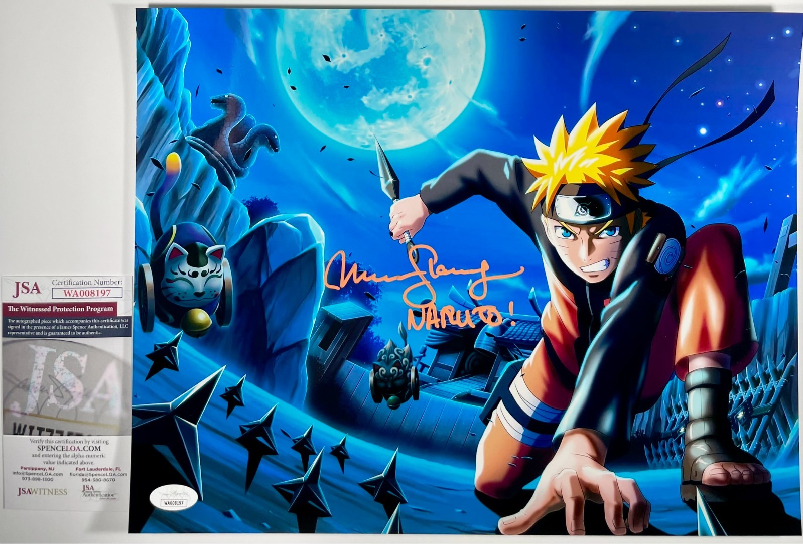 Professionally printed Metallic 11×14 Photo, hand signed in person by voice actress Maile Flanagan who is credited as the voice of Naruto in the popular animated Television Series Naruto: Shippuden as well as the US version of the Naruto films. This is a clean, well placed signature with character name “Naruto” inscription, signed in a flowing Orange 2MM Molotow Paint Pen that really pops off of this crisp, professionally printed Metallic 11×14 Photo. A clear plastic 11×14 toploader is included with purchase to safely ship the photo inside of. Item was witnessed being signed by James Spence Authentications, one of the most reputable third-party authentication companies in the world, and includes the JSA Witness Certificate of Authenticity card.