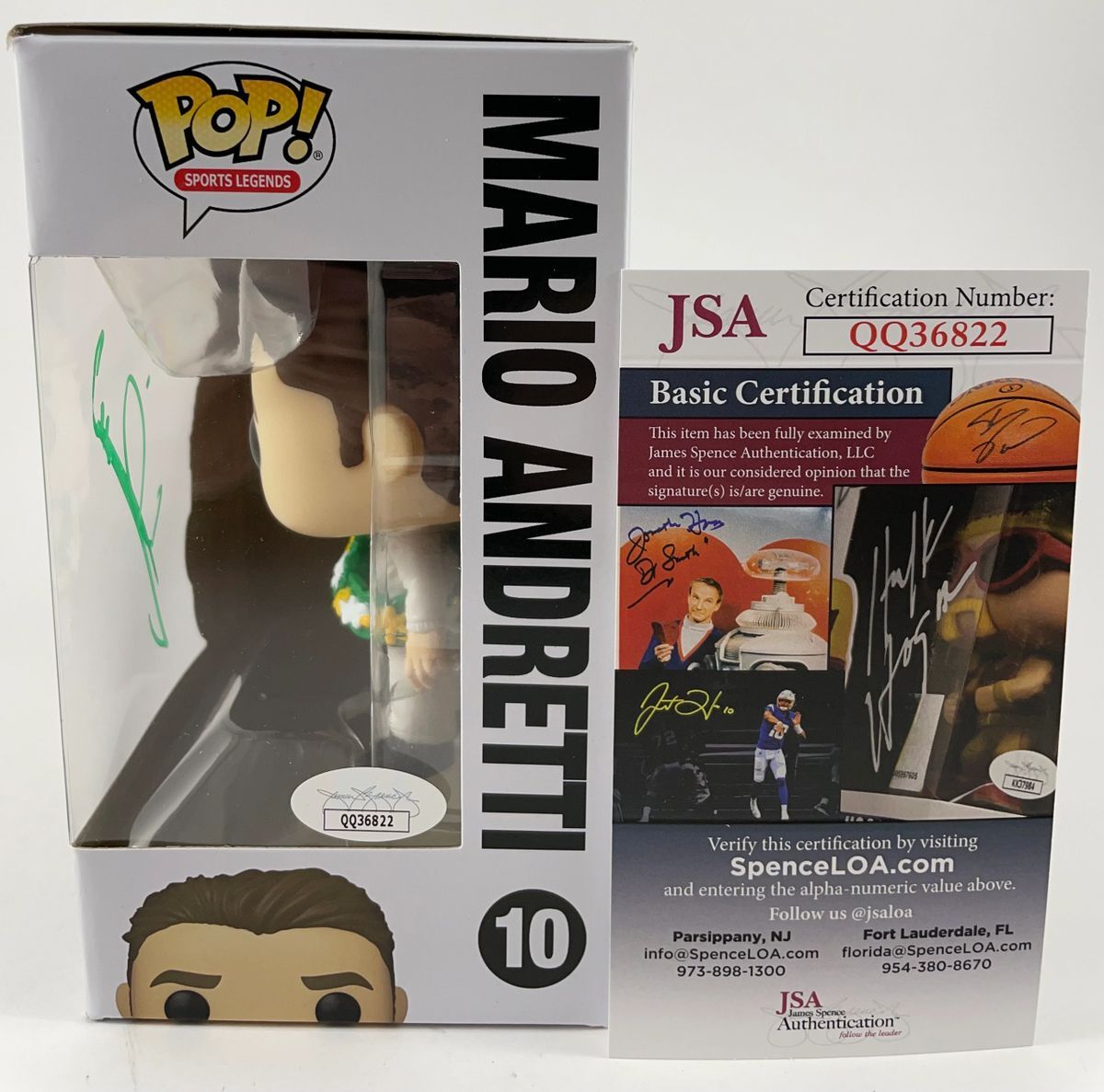 Mario Andretti Funko POP #10, hand signed by Racing Legend Mario Andretti who has won races in Formula One, IncyCar, World Sportscar Championship, and NASCAR. This is a clean, well placed signature, signed in a 2MM Green Decco paint pen that really pops off of the plastic. Item has been authenticated by James Spence Authentications, and includes the JSA Certificate of Authenticity card. JSA COA# QQ36822