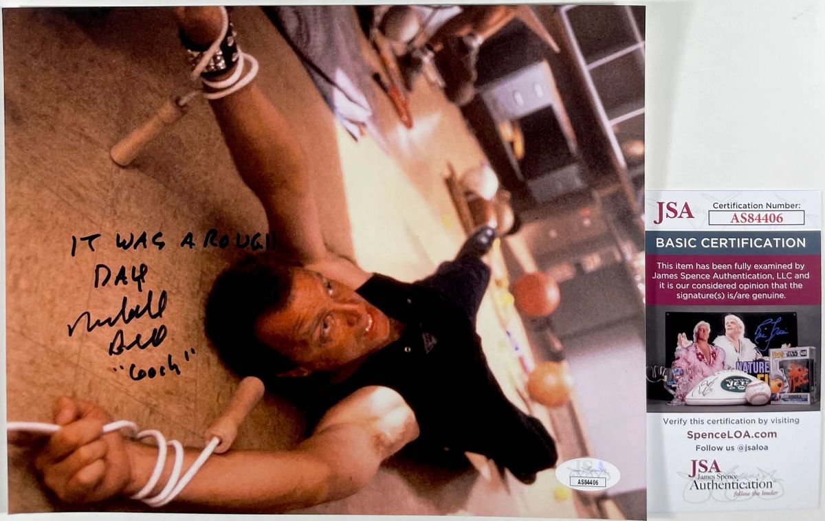 Professionally printed 8×10 photo, hand signed in person by actor Marshall Bell who played the roll of Coach Schneider in the 1985 Horror Film, A Nightmare On Elm Street 2: Freddy’s Revenge. This is a clean, well placed signature, with character name “Coach” and “It was a rough day!” inscriptions, signed in a flowing Black Sharpie that really pops off of this crisp, professionally printed 8×10 photo. Item has been authenticated by James Spence Authentications, one of the most reputable third party authentication companies in the world, and includes the JSA Certificate Of Authenticity card.