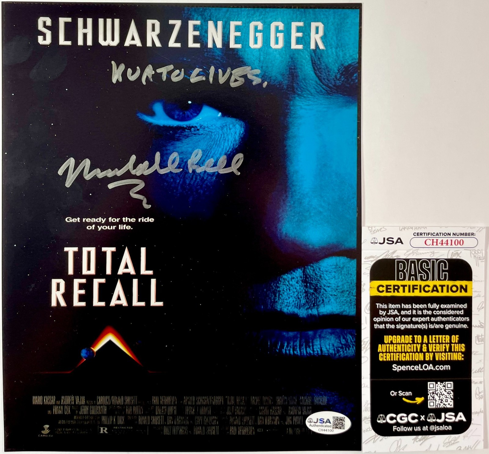 Professionally printed Total Recall 8×10 Mini Movie Poster Photo, hand signed in person by actor Marshall Bell who played the role of Kuato in the 1990 film, Total Recall. This is a clean, well placed signature, with “Kuato Lives” inscription, signed in a flowing Silver Sharpie that really pops off of this crisp, professionally printed Total Recall 8×10 Mini Movie Poster Photo. A clear plastic 8×10 toploader is included with purchase to safely ship the photo inside of. Item has been authenticated by James Spence Authentications, one of the most reputable third-party authentication companies in the world, and includes the JSA Certificate of Authenticity card.