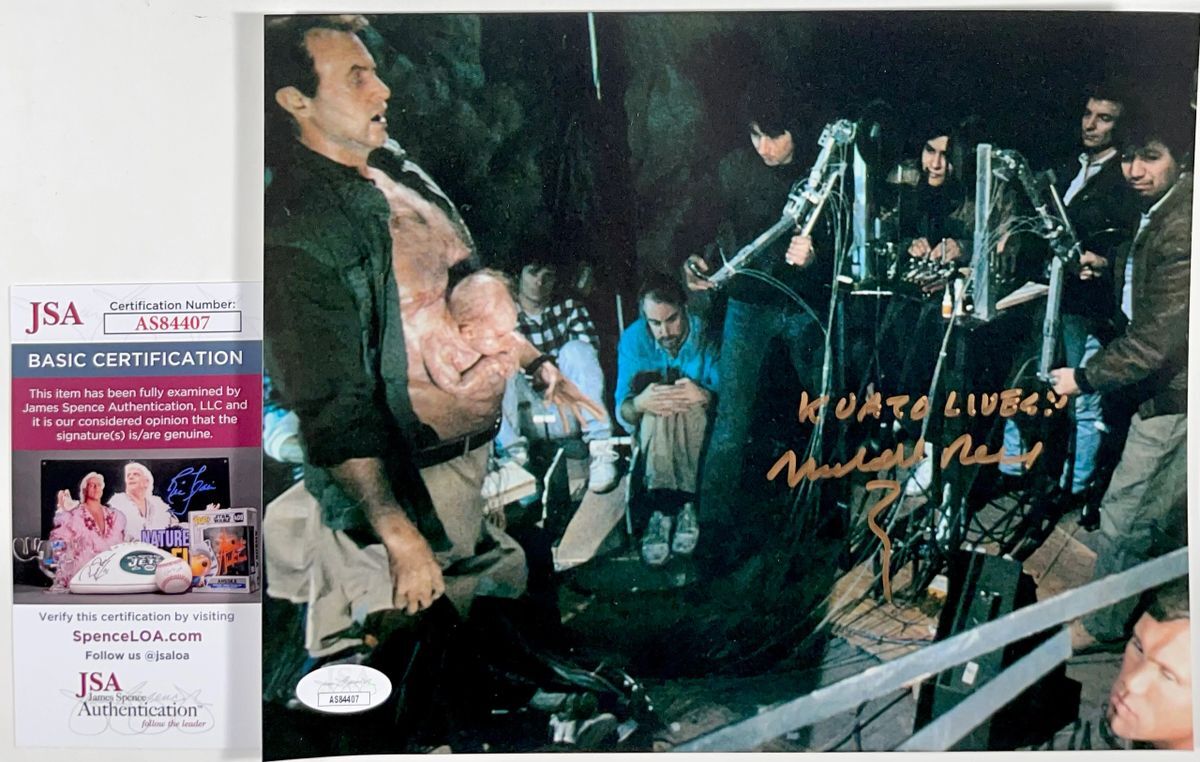 Professionally printed 8×10 photo, hand signed in person by actor Marshall Bell who played the roll of George aka Kuato in the 1990 Film, Total Recall. This is a clean, well placed signature, with a “KUATO LIVES!” inscription, signed in a flowing Gold that really pops off of this crisp, professionally printed 8×10 photo. Item has been authenticated by James Spence Authentications, one of the most reputable third party authentication companies in the world, and includes the JSA Certificate Of Authenticity card.