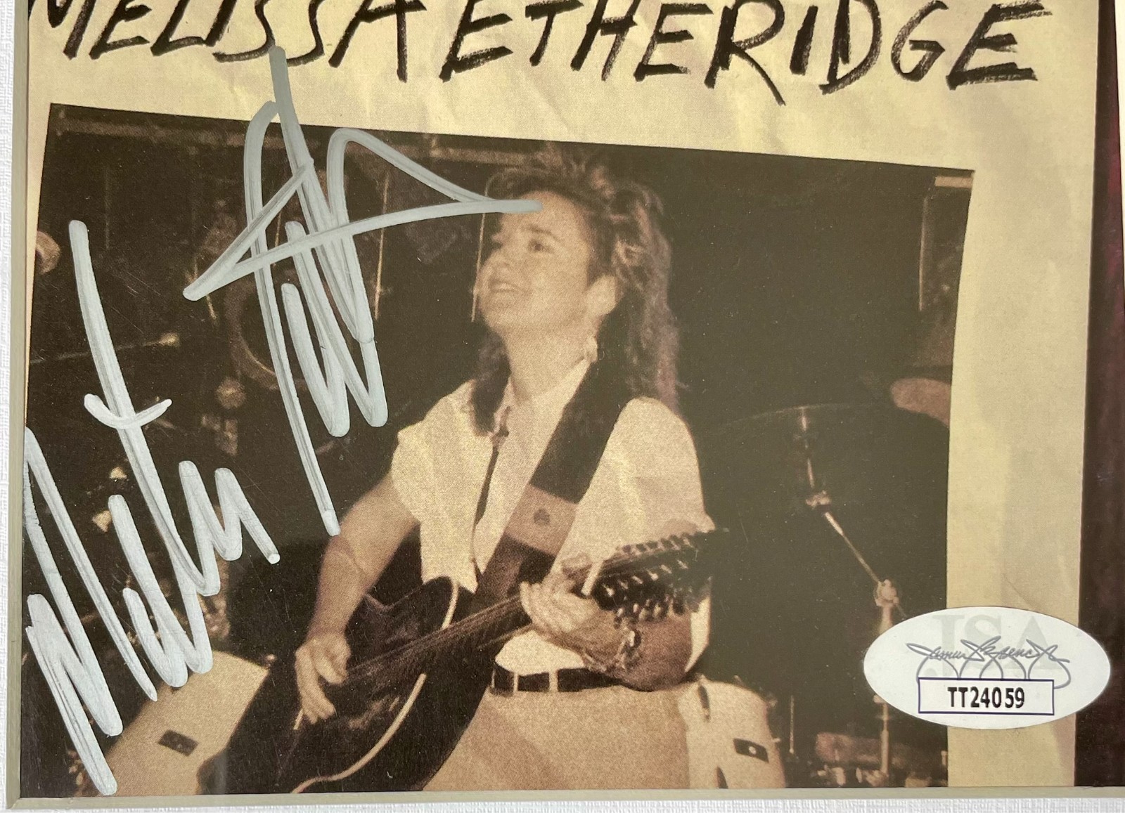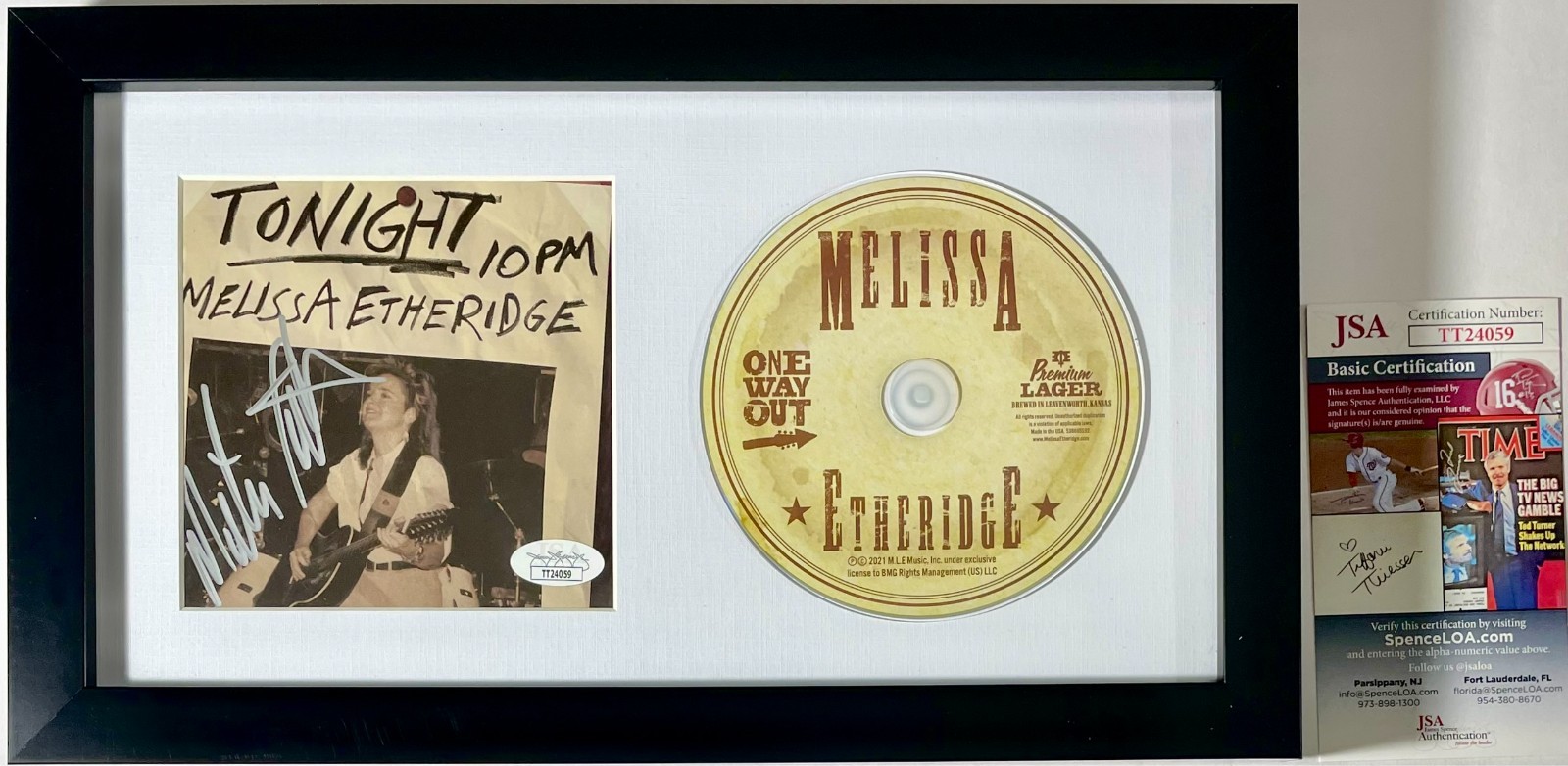 Melissa Etheridge “One Way Out” CD and signed CD Booklet, hand signed in person by two-time Grammy Award winning artist, Melissa Etheridge. This is a clean, well paced signature, signed in a flowing Silver that really pops off of this Melissa Etheridge signed “One Way Out” CD Booklet. The signed One Way Out CD Booklet and CD have been mounted inside of this sleek, ready to hang, framed and matted display. Item has been authenticated by James Spence Authentication, one of the most reputable third-party authentication companies in the world, and includes the JSA Certificate Of Authenticity card.