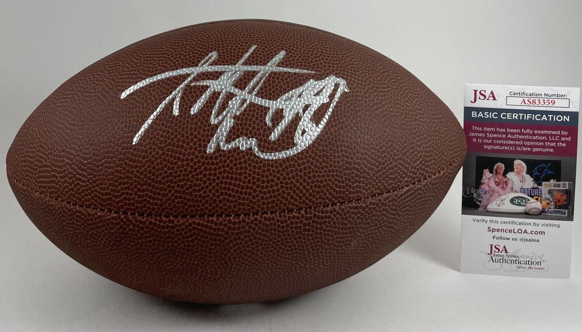 Wilson Official Size NFL Football, hand signed in person by long time Minnesota Vikings Running Back Adrian Peterson. AP played college football at Oklahoma before being drafted in the first round of the 2007 NFL Draft by the Vikings. Over the course of his lengthy career, the 2012 NFL MVP also played for the New Orleans Saints, Arizona Cardinals, Washington Redskins, Detroit Lions, Tennessee Titans, and Seattle Seahawks. This is a clean, well placed signature, signed in a flowing Silver Decco Paint Pen that really pops off of this Wilson Official Size NFL Football. Item has been authenticated by James Spence Authentications, one of the most reputable third-party authentication companies in the world and includes the JSA Certificate of Authenticity card.