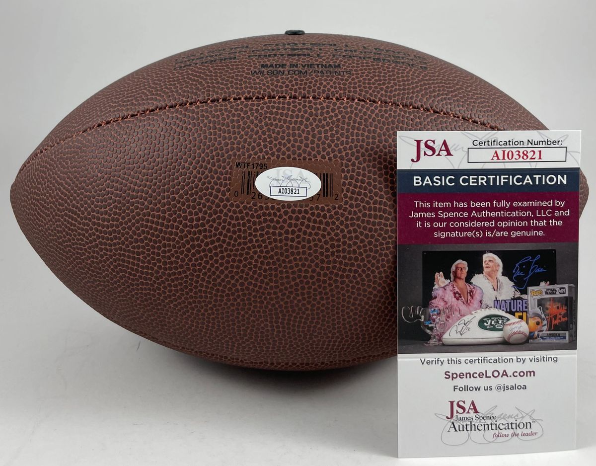 Wilson Official Size NFL Football, hand signed in person by Minnesota Vikings Tight End, T.J. Hockenson. T.J. played college football at Iowa before being drafted by the Detroit Lions and later moving to NFC North Rival Minnesota Vikings. This is a clean, well placed signature, signed in a flowing Sharpie that really pops off of this Wilson Official Size NFL Football. Item has been authenticated by James Spence Authentications, one of the most reputable third party authentication companies in the world, and includes the JSA Certificate of Authenticity card.