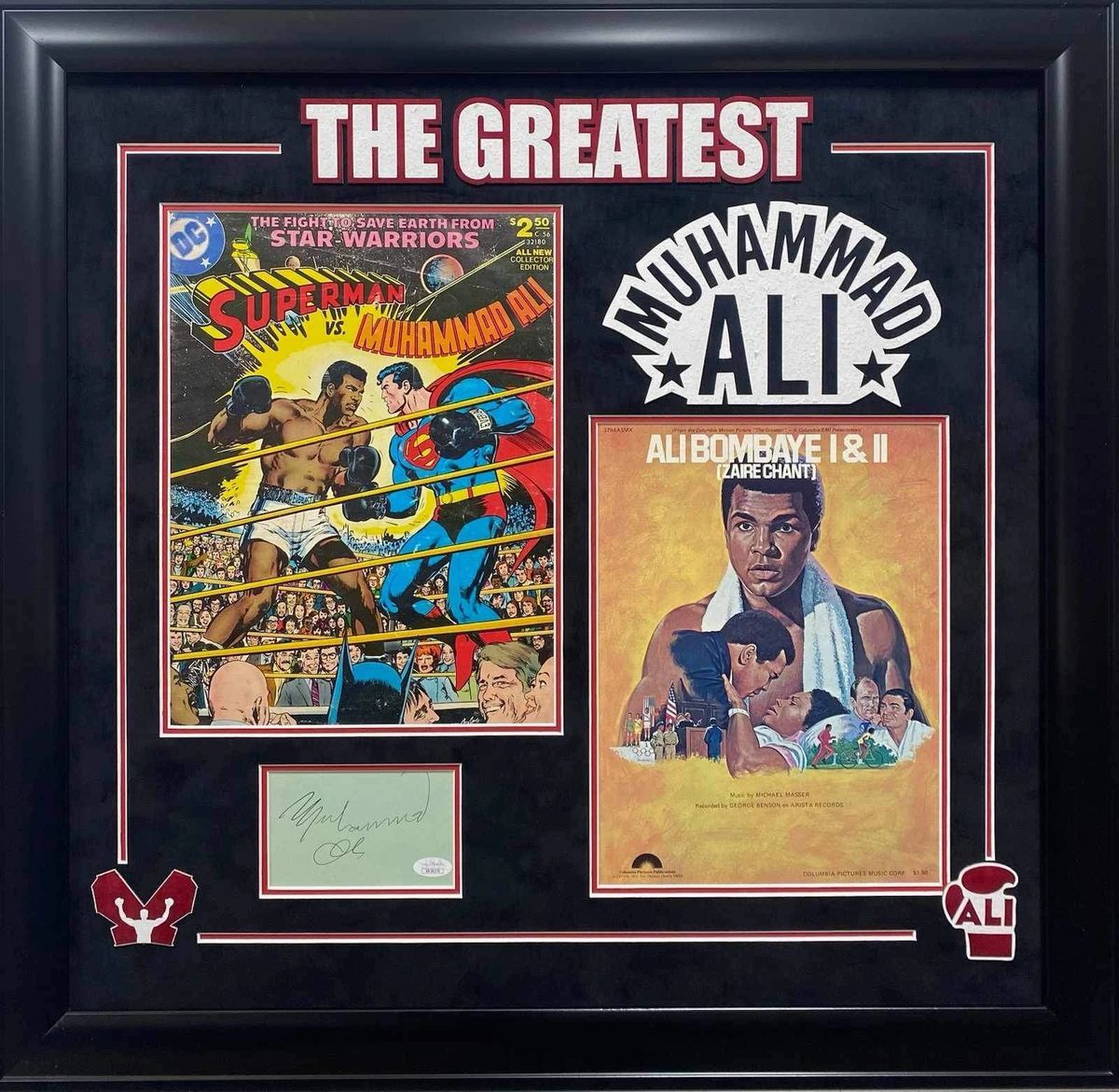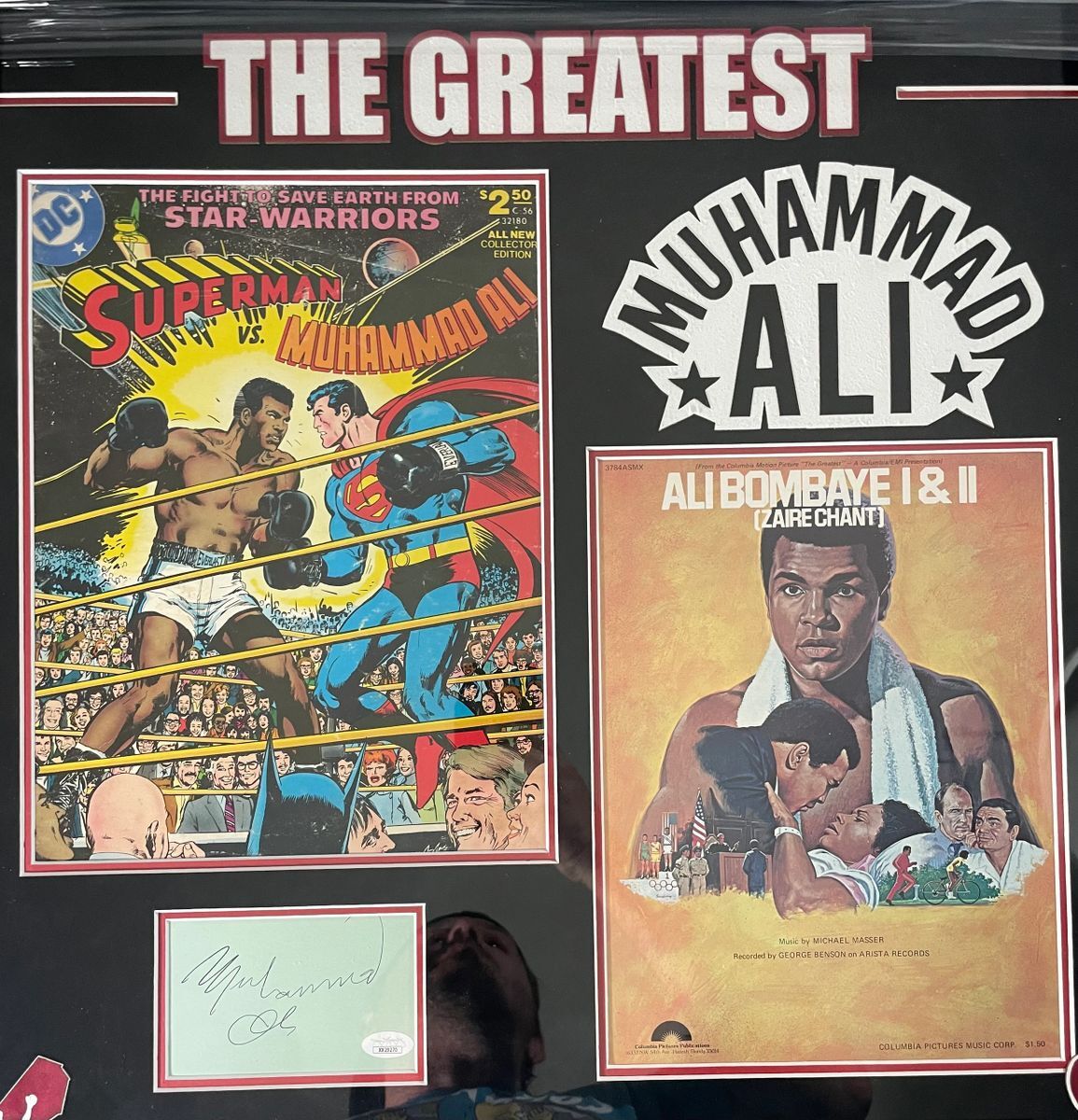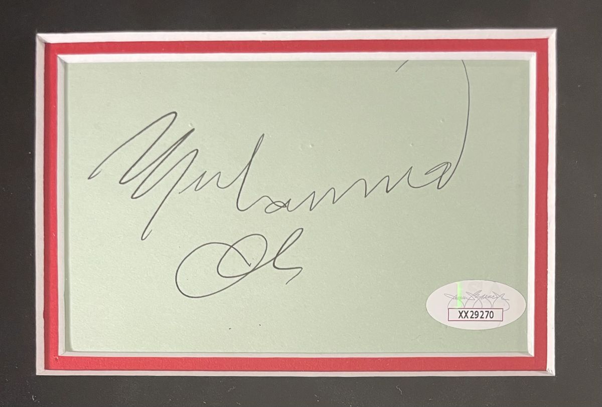 Muhammad Ali 29×27.5 Custom Framed and Matted Autograph Cut, Superman VS Muhammad Ali Giant Oversized Comic Book, and Ali Bombaye I & II Lobby Card Display. 3.5×5 Index Card Autograph Cut was hand signed in person by the Late Great Boxing Legend, “The Greatest” Muhammad Ali. Included inside of this unique custom framed display, along with the Autograph Cut is the Superman VS Muhammad Ali Giant Oversized Comic Book, as well as the Ali Bombaye I & II Lobby Card. This is an absolutely beautiful, one of a kind collectible. I can assure you there is not another one out there like it. Custom Frame and Matte were professionally done, measuring 29 inches long by 27.5 inches high and is ready to hang right out of the box. This Muhammad Ali Custom Framed and Matted Autograph Display is a stunning center piece collectible, for the serious collector who takes real pride in their Muhammad Ali collection. Item has been authenticated by James Spence Authentications, one of the most reputable third party authentication companies in the world, and includes the JSA Letter Of Authenticity which is mounted to the back of the frame. JSA LOA# XX29270 As a bonus, buyer will also receive the Muhammad Ali The Greatest Hardcover Book by John Hennessey that is shown in the photographs. Book is in used condition and will ship separately from the frame.