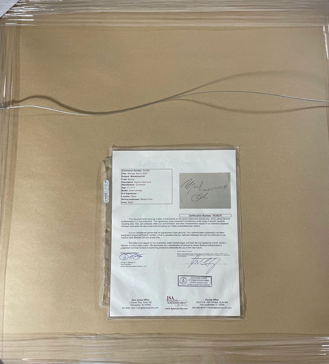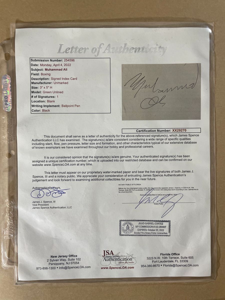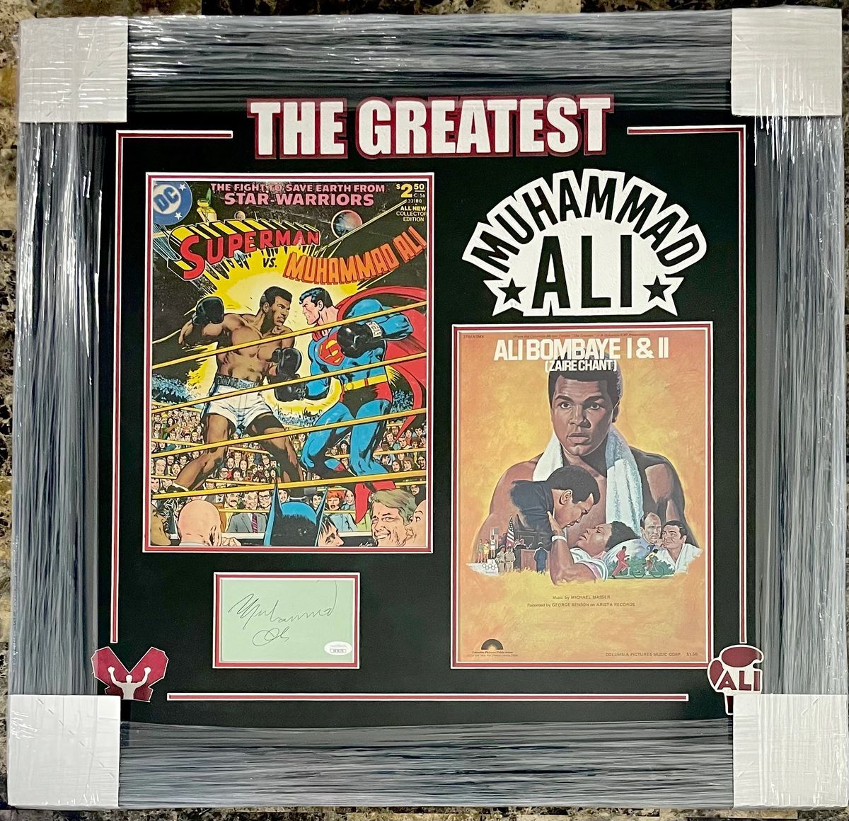Muhammad Ali 29×27.5 Custom Framed and Matted Autograph Cut, Superman VS Muhammad Ali Giant Oversized Comic Book, and Ali Bombaye I & II Lobby Card Display. 3.5×5 Index Card Autograph Cut was hand signed in person by the Late Great Boxing Legend, “The Greatest” Muhammad Ali. Included inside of this unique custom framed display, along with the Autograph Cut is the Superman VS Muhammad Ali Giant Oversized Comic Book, as well as the Ali Bombaye I & II Lobby Card. This is an absolutely beautiful, one of a kind collectible. I can assure you there is not another one out there like it. Custom Frame and Matte were professionally done, measuring 29 inches long by 27.5 inches high and is ready to hang right out of the box. This Muhammad Ali Custom Framed and Matted Autograph Display is a stunning center piece collectible, for the serious collector who takes real pride in their Muhammad Ali collection. Item has been authenticated by James Spence Authentications, one of the most reputable third party authentication companies in the world, and includes the JSA Letter Of Authenticity which is mounted to the back of the frame. JSA LOA# XX29270 As a bonus, buyer will also receive the Muhammad Ali The Greatest Hardcover Book by John Hennessey that is shown in the photographs. Book is in used condition and will ship separately from the frame.