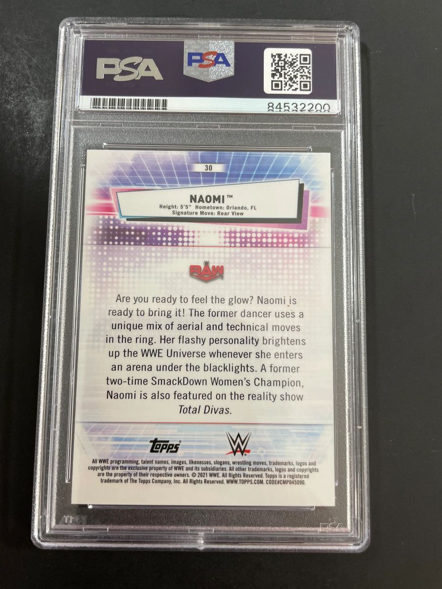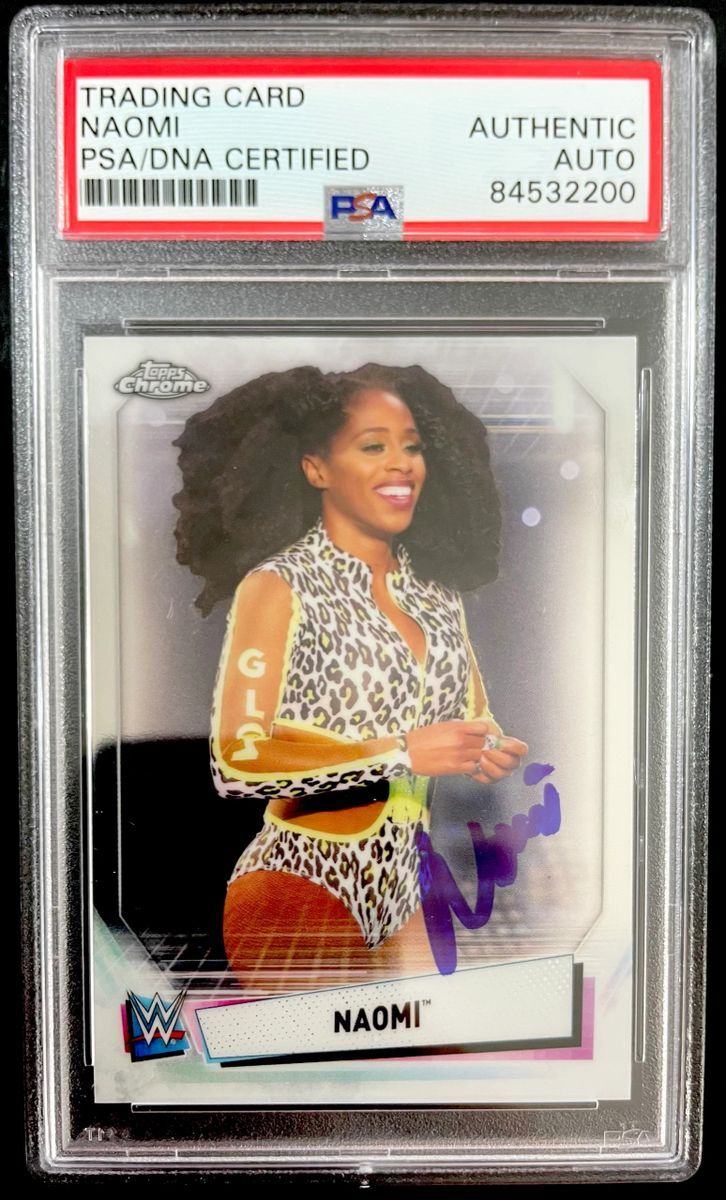 Naomi 2021 Topps Chrome WWE Trading Card #30, hand signed in person by two-time WWE Smackdown Women’s Champion, Naomi aka Trinity Fatu. This is a clean, well placed on card signature, that really pops off of this 2021 Topps Chrome WWE Trading Card. Item has been authenticated and slabbed / encapsulated by PSA/DNA. PSA/DNA COA# 84532200